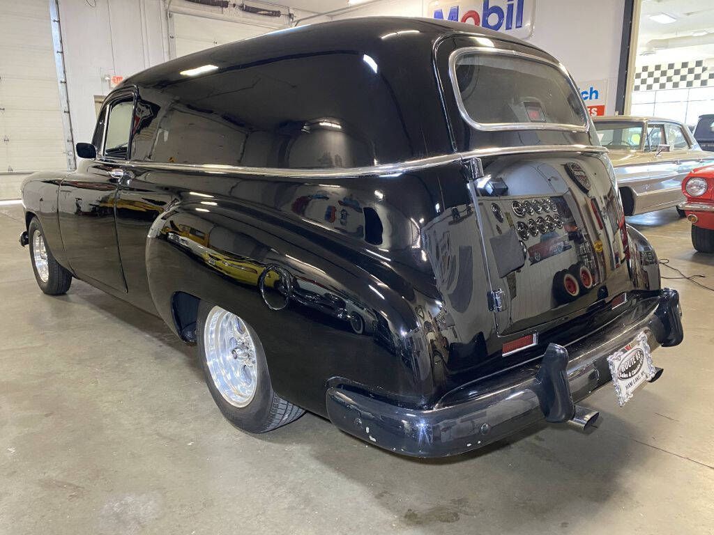1949 Chevrolet Styleline Sedan Delivery finished in black with a black interior. The exterior is completely done, with areas in the interior needing work as they have not been finished 100% yet. The headlight housings are customized, and the grille is changed over to the 1951 Chevy style. Under the hood is an SBC 350 CID V8 paired with a TH400 transmission. Inside, the dash is changed to the 1951 style while adding a tach, engine temp, and oil pressure gauge. Other upgrades include black bucket seats shaved rear door handle with an electronic door popper, and a wood subfloor added in the back, with a spot for spare and storage. It starts up with no issue and cruises nicely on the road. The overall fit and finish of this build are great. Very little is needed to finish this vehicle up, so you can enjoy it now as-is or take it to the next level.