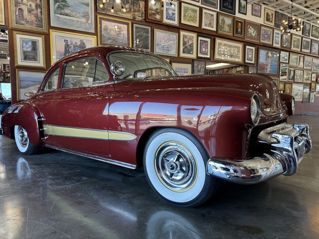 The car has a spliced-in 1949 Merc grille shell and a complete 1951 Olds front bumper and grille bar. 1956 Plymouth Fury side trim.