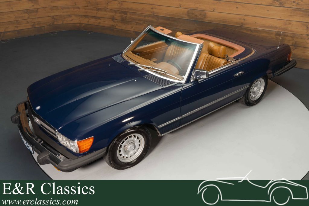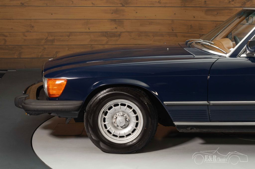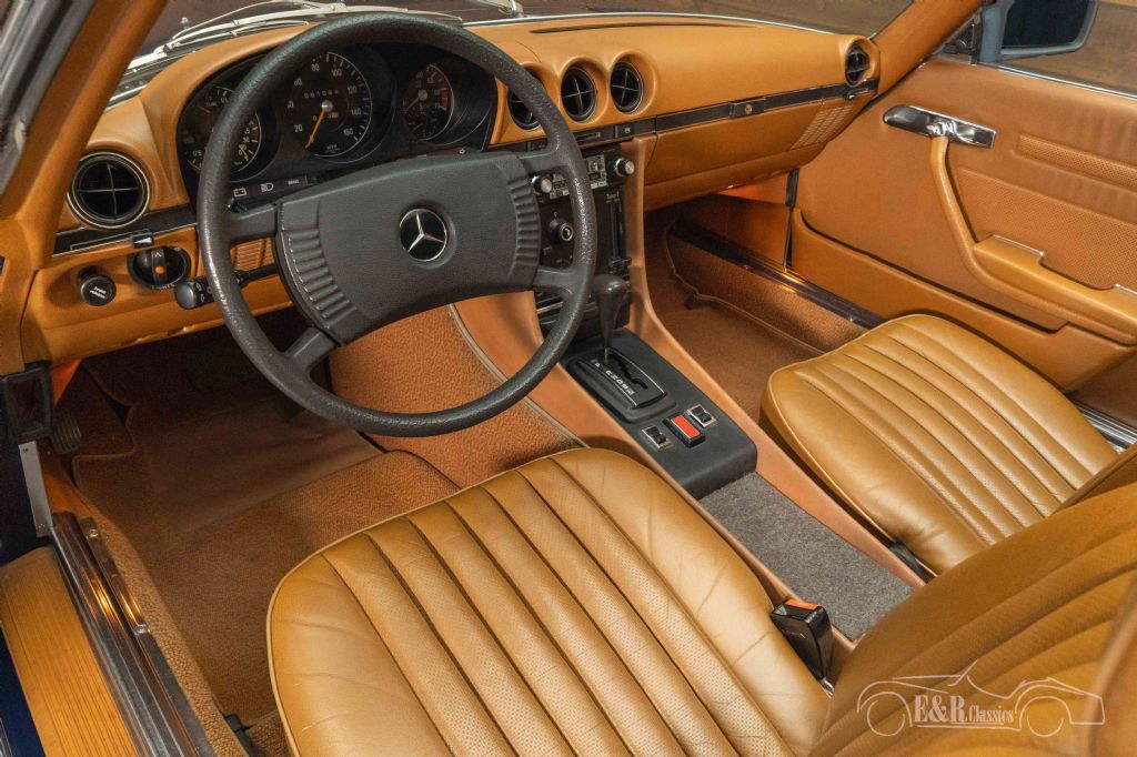 Dark blue Mercedes-Benz 450 SL for sale The Mercedes-Benz that we offer for sale here is finished in a beautiful dark blue paintwork that looks great on the classic and combines nicely with the chrome and the Baroque wheels. The brown interior is in a neat condition and contrasts nicely with the dark blue paintwork. The Mercedes-Benz is equipped with a dark brown soft top that you can easily fold in as soon as the sun shines.
