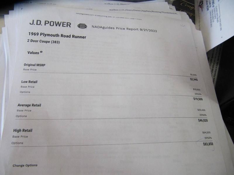 3 owner-100% Original-Over 200 pages of Original Documents-Window Sticker-Build Sheet -Bill of Sale-On & ON-All Numbers Matching-California Rust Free Original Road Runner with 60,000 Actual Miles-383-4-speed-Power Steering-AM-FM Radio with Optional Speakers-Power Door Locks and Compustar Alarm System-Get to Close and Alarms and Send photos to owner. Once in a Lifetime Chance- Won Every Show it's ever been in. Concourse Original Condition. Belonged to the President of the Road Runner Club in California. 1 of a Kind.