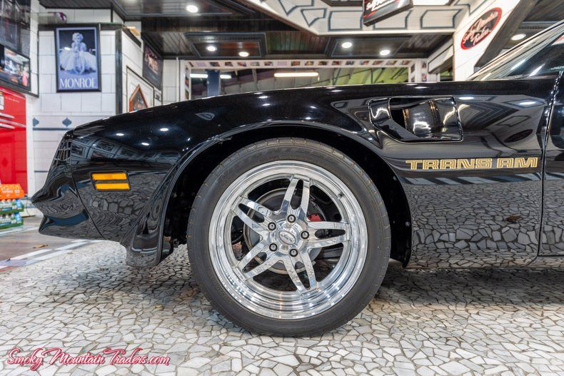 We will start with the exterior of this '78. The body on it is laser straight down the sides and all of the lines flow seamlessly from front to back. Countless hours were spent prepping and setting this body up to showcase the Starlight Black paint. It's done in the base coat clear coat combo that has been wet sanded, buffed, and polished out to a mirror finish that's slick as a ribbon. It's complimented by the iconic Phoenix on the hood along with the Gold TRANS AM badging. All the glass is beautiful and has been tinted to complete the look. We can see both the front and rear bumpers are excellent along with all of the tail lights and headlights. To finish off the stance it's sitting on a set of Body Coddington Blaster wheels with 18x8.5 up front and 18x9 in the rear.