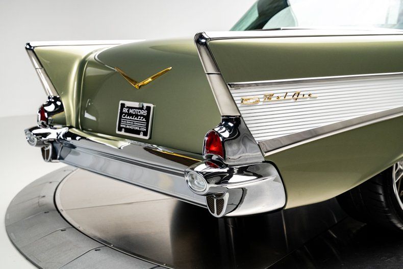 The lines of this '57 Bel Air are nothing short of breathtaking, with an expertly restored and perfected body finished in a custom two-tone green paint that perfectly complements its aggressive stance. Every curve, every detail, has been honed to perfection to create a car that's as visually striking as it is mechanically precise.