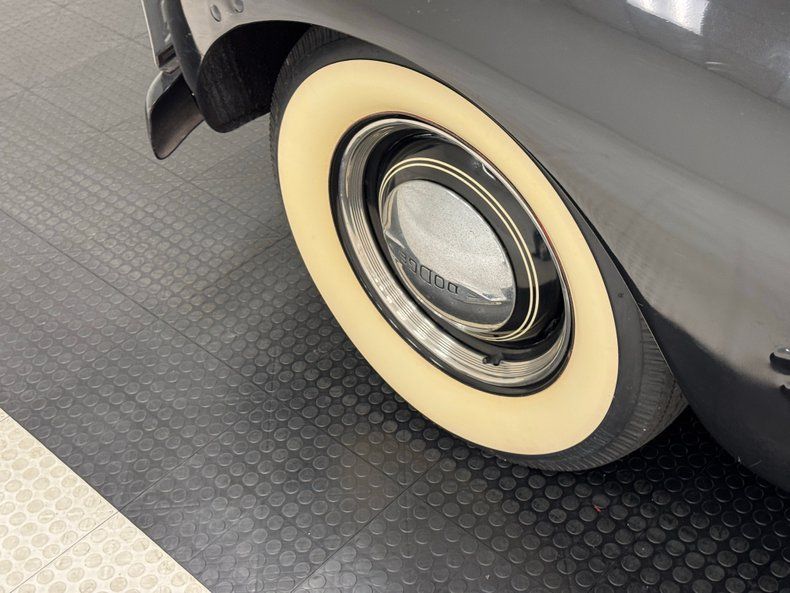 Exterior With the front of the truck looking very similar to the Dodge cars of the day, it is well preserved with all the correct chrome trimmings, a rounded V grille with horizontal wings stretching towards the big round fenders. On top of the grille is a vertical strip that makes its way from the middle of the grille through the hood ornament and fades back to the windshield. A nicely preserved bumper runs across the front and also frames the rounded front fenders. On top of each of these fenders is a seal beam headlight with separate mounted amber turn signals in the round. These fenders streak past the hood, and dive downward towards a running board. This running board allows easy access to the cab and ties into another rounded rear fender then moves upward from the rear portion of the board and frames the rear wheel as well as butts up against the steel cargo sides. A beige insert is adorning the tops of the cargo sides and is begging for your business logo and phone number. On back is a single tail light on the left access door along with round tail lights adoring the swooping rear fenders on either side, and another nicely preserved bumper running across the back. On all 4 corners are dog dish style chrome wheel covers with Dodge logo centers wrapped in 16-inch wide whites. Near flawless Arbor Green coats the bulbous body, while black is reserved for the swoopy fenders and running boards.