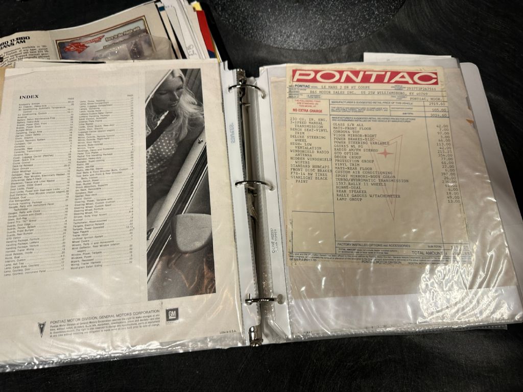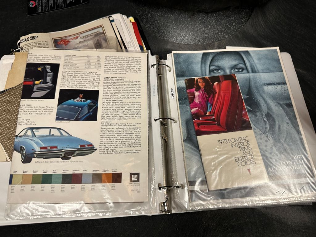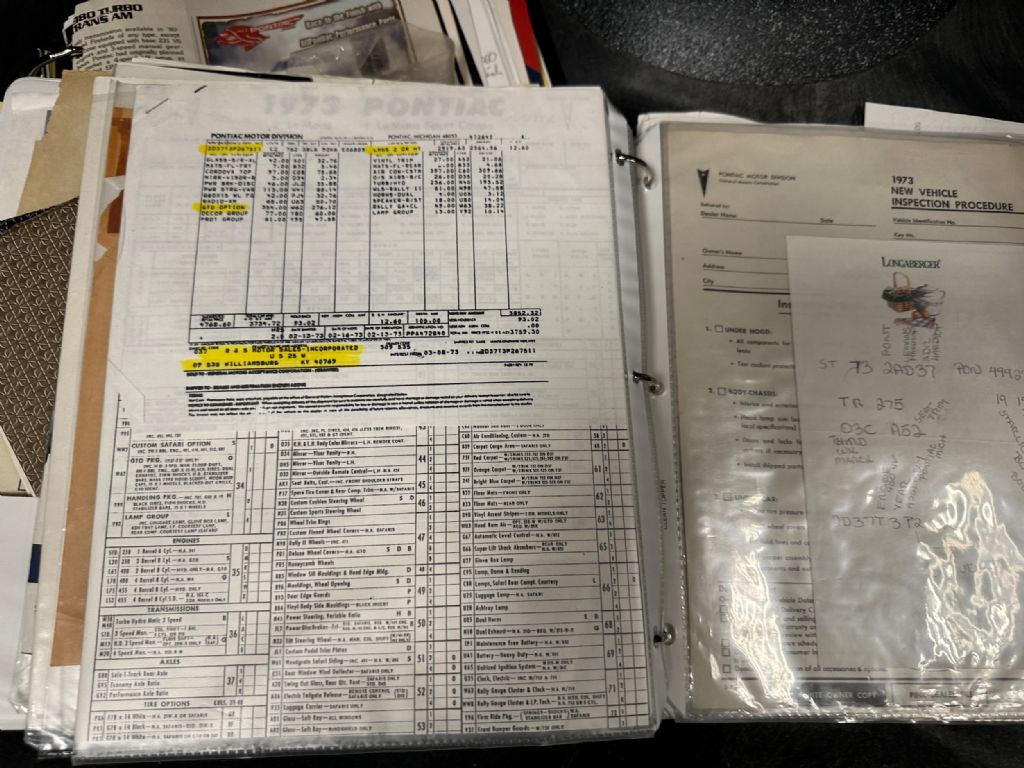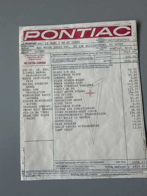 1973 PONTIAC GTO SPORT COUPE 400 CI V8 AUTO - AIR- RARE ONLY 282 PRODUCED MATCHING NUMBERS YEAR: 1973 MAKE: PONTIAC MODEL: GTO BODY: HARDTOP COLOR: BLACK / BLACK TOP TRIM: BLACK ENGINE: 400 CI V8 TRANS: AUTOMATIC REAR: 3:23 TO 1 MILES: 84,005 EXEMPT SERIAL#: 2D37T3P267511 OPTIONS *GTO OPTION *TINTED GLASS *CORDOVA TOP *POWER STEERING *POWER DISC BRAKES *AM /FM RADIO *DECOR GROUP *PROTECTIVE GROUP *VINYL TRIM *AIR CONDITIONING *SPORT MIRRORS *TURBO AUTO TRANS *RALLY 2 RIMS *REAR SPEAKER *RALLY GAUGES TACH *LAMP GROUP SERIAL NUMBER BREAKDOWN 2D37T3P267511 2-PONTIAC D37-LEMANS SPORT COUPE T-400 V8 3-1973 P-PONTIAC PLANT 267511 SEQUENCE COWL TAG ST73 2AD37-1973 LEMANS SPORT COUPE PON499298 PLANT # TR276 - BLACK BENCH PNT-19-19-BLACK 03C-BUILT 3RD WEEK OF MARCH A52-SEAT TRIM RESTORATION FRAME-OFF RESTORATION. COMPLETE NUTS AND BOLT RESTORATION RATED 9/10 QUALITY. COMPLETE DRIVELINE REBUILD. ALL ELECTRICAL AND MECHANICAL PERFECTION (BRIGHTWORK PERFECT) INTERIOR 10/10 ORIGINAL MOTOR 400 YS WAS OVERHAULED 30 OVER 62. HEADS 10.5 TO 1 COMPRESSION. CRANE CAM. EDELLBROOK INTAKE. PERTRONIX IGNITION. 26 YEARS TO COMPLETE PROFESSIONALLY. POWERFUL HISTORY ORIGINAL 1973 PONTIAC GTO WAS BOUGHT NEW IN WILLIAMSBURG, KY. OWNED BY THE LAST OWNER FOR 26 YEARS. STORED AND MAINTAINED IN SOUTH FLORIDA. ONLY 4806 GTO BUILT IN 1973 AND ONLY 282 SPORT COUPES IN THIS COMBO. ONLY A HANDFUL OF BLACK GTOARE AROUND AND NONE THIS WELL RESTORED.