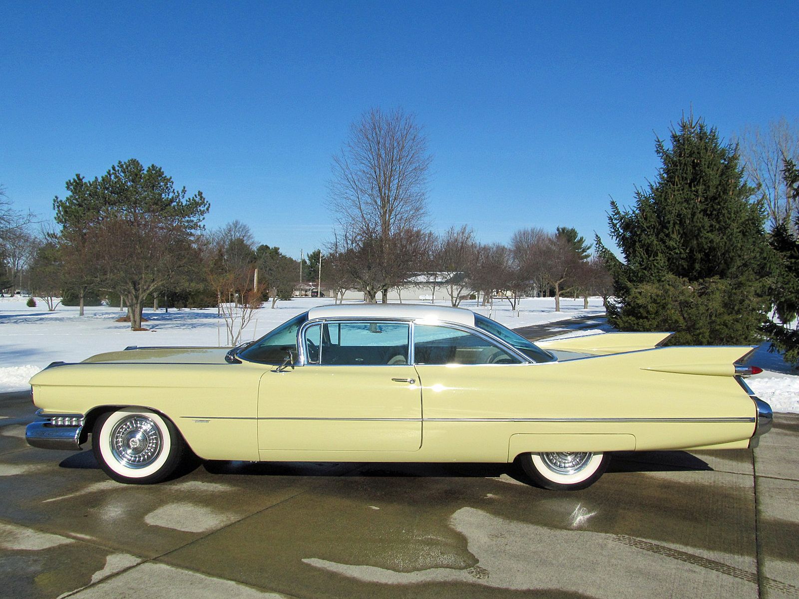 1959 Cadillac Series 62 Coupe. Call Pete or Andy 419-668-1884. The most iconic tailfins ever created! The zenith of jet-age style! Excellent. Style Number 6237. Finished in Color Code Correct number 40 Gotham Gold with Color Code Correct number 12 Dover White roof. The interior is finished in Trim Code Correct number 35 Fawn Mojave Cloth and Fawn Coated Fabric. Numbers Matching Engine, Chassis and Service Tag. Powered by Cadillac’s 390 Cubic Inch V-8 which was rated at 325 horsepower. Dual Exhaust. Hydra-Matic Automatic Transmission. This Cadilac is equipped with lots of great features. Power Windows. Power Steering. Power Brakes. Power Antenna. AM Radio. Clock. Heater / Defroster. Day / Nite Rearview Mirror. Remote Driver Mirror. Rear seat arm rest. E-Z-Eye Tinted Glass. Radial Wide White Wall tires. The Doors even lock and unlock with the key! Ready to Drive, Show and Enjoy. Call Pete or Andy 419-668-1884 BE SURE TO WATCH THE VIDEO!