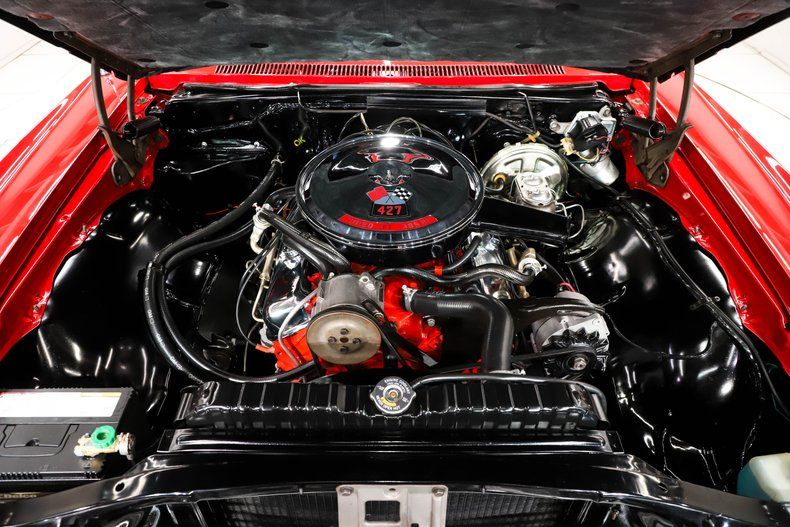 EXTERIOR: California born and raised rust free metal. This full-size muscle car looks fast with its sleek fastback design. It is laser straight and the panels fit precisely. All the chrome and trim are straight and sparkles like jewelry. I especially love the 427 cross flags on the fenders and the grilles on the hood that are unique to the SS 427. The factory Bolero Red color is laid out and polished like glass. The windshield and all the seals were replaced. The vinyl top looks new. 15 inch wheels were also a part of the SS 427, they are new looking rallys wrapped in reproduction redline tires.