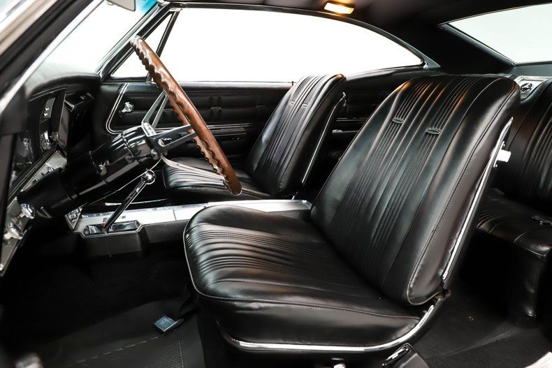 INTERIOR: Outstanding from carpet to headliner! It was completely gutted and put back together to look and function as it did on day one! All the soft items like the upholstery, door panels, carpet, headliner, visors etc. are in excellent shape. The fit and function is also impressive. All the bits and pieces: knobs, dash pad, glove box liner, heater controls look great as well. The 4-speed console is looking really good and has a correct reverse lock out shifter sticking out of it. There are some really great features including the rally dash with a tachometer, gauges, and clock. That multiplex 8-track stereo is rare and actually functions. It also has a deluxe wheel with reproduction floor mats on the floor as well.