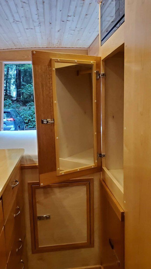 " THE WALLS OF THE SHOWER AND CUPBOARDS ARE MADE OF SOLID MAPLE, DOORS IN MAHOGANY