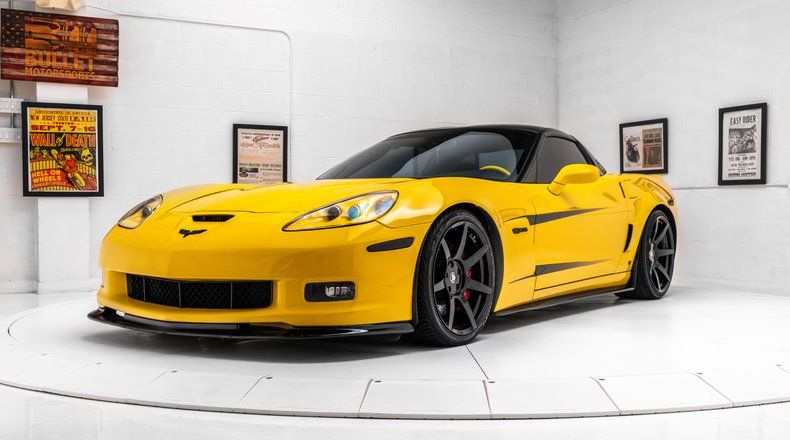 The C6 featured a hydro-formed aluminum chassis paired with composite and carbon-fiber bodywork, and this example is finished in Velocity Yellow Tintcoat with black accents. Additional exterior details include xenon headlights, fog lights, and quadruple exhaust outlets as well as aftermarket badges, marker lights, and taillight assemblies with tinted lenses. Staggered-diameter Project 6GR wheels are finished in black and mounted with 275/30-19 Advanta HPZ-01 front tires and 325/25-20 Lexani LX-Twenty rear tires. Braking is handled by red-finished Corvette-branded calipers over cross-drilled and ventilated discs at each corner.