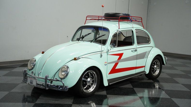 Finished in vibrant teal with racing-inspired red accents, this 1966 Volkswagen Beetle underwent a complete transformation by a skilled paint artisan. The body received full disassembly, metal stripping, epoxy primer, and premium PPG base/clear coat application for a superior finish. The red roof rack and coordinated side stripes give this Bug a rally-inspired appearance that's uniquely its own. Sitting deliberately low on 15" EMPI Sprintstar wheels with polished edges, the 175/65R15 front and 205/65R15 rear tires plant this German classic firmly on the asphalt with a purposeful stance.