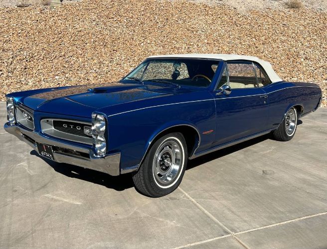 1966 Pontiac GTO Convertible This 1966 Pontiac GTO Convertible is a true classic, equipped with the period-correct 389 Tri-Power V8 engine and a 4-speed manual transmission for an authentic driving experience. It features power steering, power drum brakes, and a brand-new vinyl parchment interior, along with seat belts for added safety. The white power top complements the cars stunning appearance, while the 215/70R14 tires provide a smooth ride. The engine compartment shines with plenty of chrome, giving it a polished, attention-grabbing look. The car is finished in its factory color, "Barrier Blue," and boasts a Dakota Digital Dash, Vintage A/C, and Halogen headlamps with LED tail lamps for a mix of classic style and modern upgrades. For entertainment, it comes equipped with a Custom Autosound USA 230 AM-FM radio and SiriusXM Satellite Radio. This "66" GTO is a beautifully preserved, real-deal Goat with no major modificationsjust a gorgeous example of muscle car history that commands attention on the road. Located in Lake Havasu, AZ 86403 For more information, please call 833-265-6113 and mention ID 97885