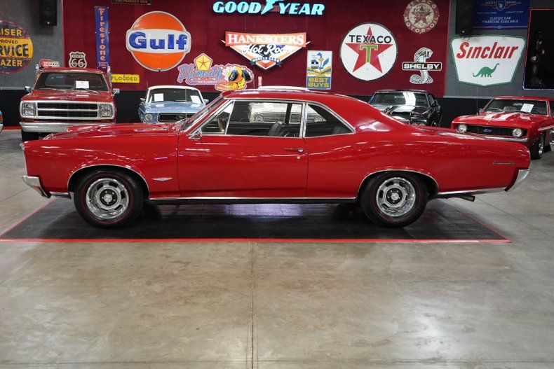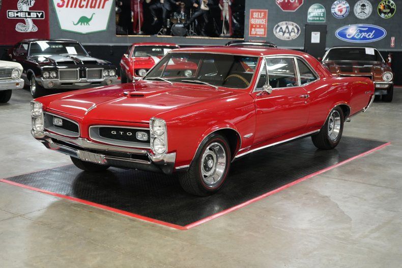 This stunning 1966 Pontiac GTO captures the essence of classic muscle, featuring a period-correct 389 V8 with the legendary Tri-Power intake and three Rochester 2-barrel carburetors. Paired with a Muncie 4-speed manual transmission and a Hurst shifter, this GTO delivers true driver engagement. It's equipped with power steering, power brakes, and 4-wheel drum brakes for a balanced ride. The red exterior is complemented by a black vinyl interior and 15" Pontiac Rally wheels wrapped in BFGoodrich Silvertown Redline tires. Performance details include an aluminum radiator, Auto Meter gauges, and OEM-style ignition. A true icon of American performance.