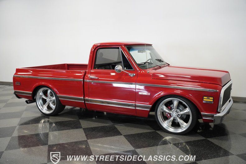 454 V8 Engine 700R4 4-Speed Automatic Transmission Edelbrock Single 4-Barrel Carburetor Pro Gear 3:42 Rear Axle CPP 13" Front Big Brake Kit CPP 12" Rear Brake Kit Drilled and Slotted Rotors Tubular Upper Control Arms New Lower Control Arms Steering Linkage Kit Front Coil Springs with 2" Drop Bolt-in C Notch in Rear Dual FlowMaster Exhaust Red Paint Billet Grille 22" American Racing Wheels 265/30ZR22 Front, 295/30ZR22 Rear Lionheart Tires Color-Matched Bedliner Black Interior with Contoured Bench Seat and Fold-Down Armrest Aftermarket Steering Wheel Alpine AM/FM/AUX Stereo with Bluetooth Air Conditioning Power Steering Column Shifter Rubber Floor Mats with Chevy Emblems