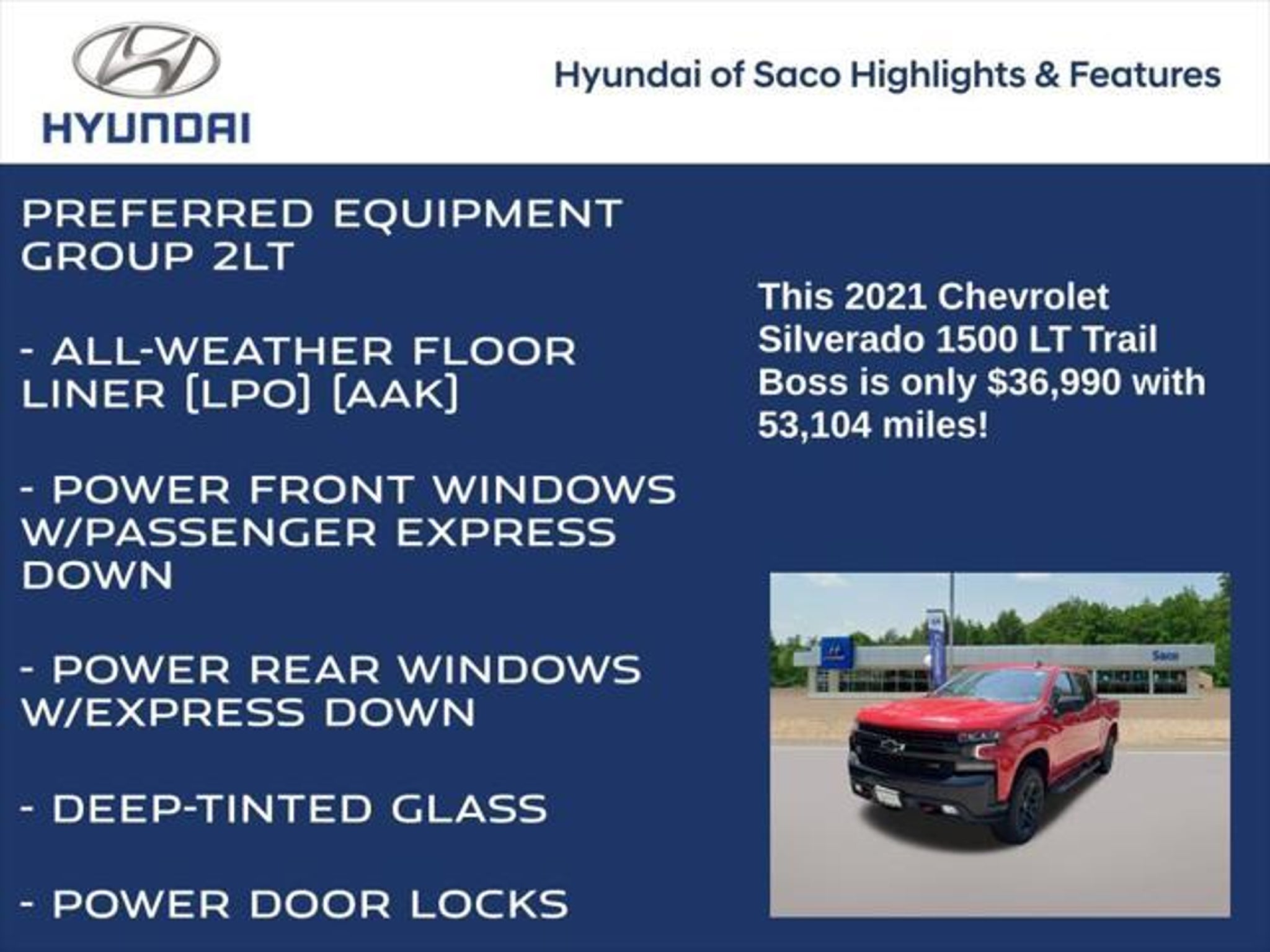 2021 Chevrolet Silverado 1500 LT Trail Boss 4WD Red Hot 10-Speed Automatic EcoTec3 5.3L V8 10-Speed Automatic 4WD Black Cloth Interior 10-Way Power Driver Seat w/Lumbar 12-Volt Rear Auxiliary Power Outlet 170 Amp Alternator 2 USB Ports (First Row) 4.2 Diagonal Color Display Driver Info Center 4G LTE Wi-Fi Hot Spot Capable 6-Speaker Audio System All-Weather Floor Liner Auto-Locking Rear Differential Auxiliary External Transmission Oil Cooler Chevrolet Connected Access Capable Cloth Rear Seat w/Storage Package Color-Keyed Carpeting Floor Covering Compass Convenience Package w/Buckets Seats Deep-Tinted Glass Dual Exhaust w/Polished Outlets Dual-Zone Automatic Climate Control Electric Rear-Window Defogger Electrical Lock Control Steering Column Electronic Cruise Control EZ Lift Power Lock & Release Tailgate Floor Mounted Center Console Front LED Fog Lamps Heated Driver & Front Outboard Passenger Seats Heated Steering Wheel Heavy-Duty Air Filter High Gloss Black Grille High Gloss Black Mirror Caps Hill Descent Control Hitch Guidance Keyless Open & Start Leather Wrapped Steering Wheel LED Cargo Area Lighting LED Reflector Headlamps Manual Tilt/Telescoping Steering Column OnStar & Chevrolet Connected Services Capable Performance Red Recovery Hooks Power Door Locks Power Front Windows w/Driver Express Up/Down Power Front Windows w/Passenger Express Down Power Rear Windows w/Express Down Preferred Equipment Group 2LT Rear Dual USB Charging-Only Ports Rear Vision Camera Remote Vehicle Starter System SiriusXM Radio Standard Tailgate Steering Wheel Audio Controls Suspension Package Theft Deterrent System (Unauthorized Entry) Trailering Package. Certification Program Details: Certification Program Details: SIGNATURE CERTIFIED POWERED BY ALLSTATE! INCLUDES A RIGOROUS 70 POINT VEHICLE SAFETY INSPECTION AND A COMPLIMENTARY 6 MONTH - 6,000 MILES LIMITED WARRANTY