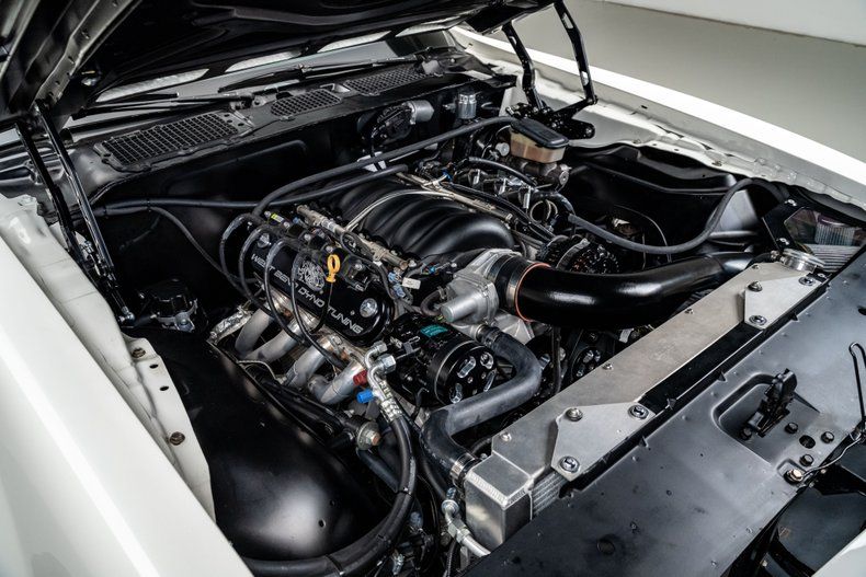 The body was stripped and reworked with new sheet metal where needed, including freshly mini-tubbed rear quarters, and refinished in a sharp white hue that pays tribute to the car's original Cameo White build. Flush-fit front and rear glass adds a modern edge without disrupting the mostly stock-appearing trim, which still includes original-style bumpers, turn signals, sport mirrors, and the signature nostril-style hood scoops. The Firebird sits with purpose on staggered 19-inch front and 20-inch rear Forgeline S03P wheels wrapped in sticky Pirelli P-Zeros, 285mm up front and 325mm out back.