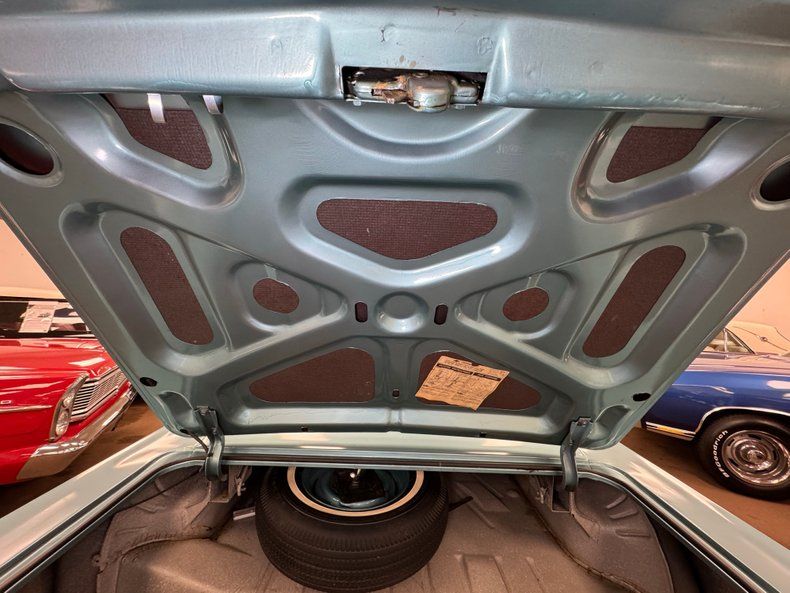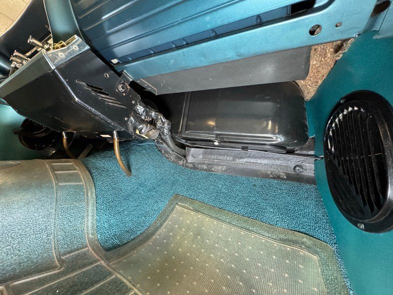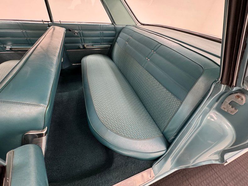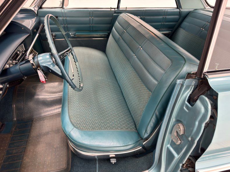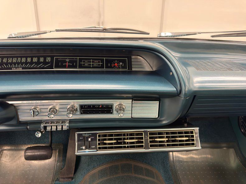 The door panels are textbook 60's with geometric patterns and grommets in Teal vinyl enhanced by silver window cranks, door actuators, and ever present ashtrays for rear passengers, and all four are in nice shape. The patterns continue on the Teal bench seats made of vinyl and cloth, repeated on the back bench and both are just about flawless. Two shades of blue adorn the plastic steering wheel, skinny by today's standards, with a silver horn half ring and that epic Impala logo on the center cap. The big opening through the two spoke wheels allows us to view the horizontal speedometer and other gauges that carry on the theme of rectangles. A metal plate runs below the gauges and houses all the necessary buttons, knobs, and AM radio. A Nordic AC unit is mounted under the dash and per our consignor, has been converted to R134a. A one piece vintage plastic mat covers the Teal looped carpet and while it's yellowed slightly with age, the carpet has remained protected and clean. The headliner and visors are in excellent shape.
