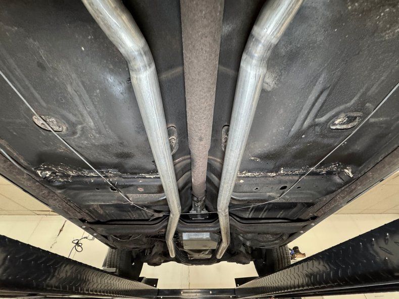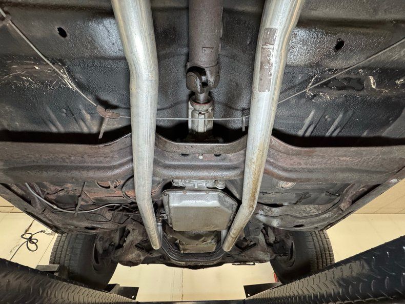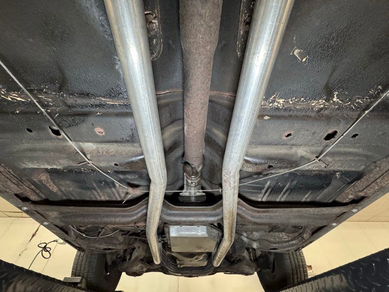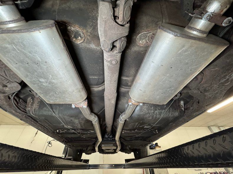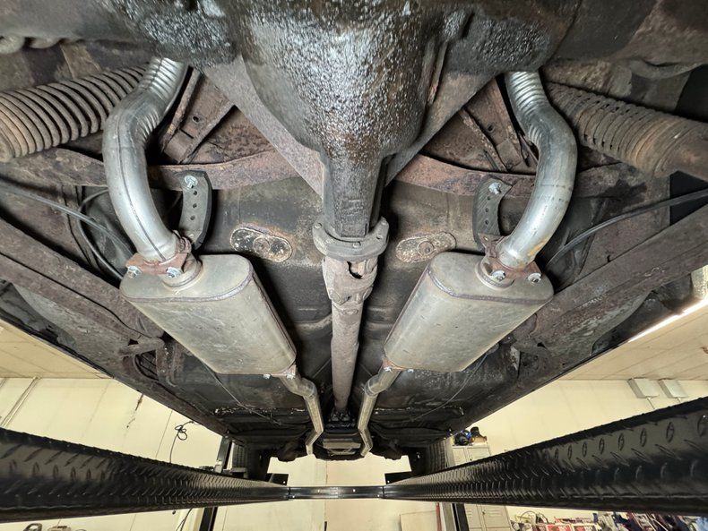 We hoist the green giant onto the lift and find a used by not overly dirty underside. There's surface rust, oil on the pan, caked on grease, and even some rust through on underside panels, but overall less tired than we expected. The dual exhaust stands out as newer as the pipes run through stainless steel mufflers and exit discreetly before the rear bumper. Suspension is made up of coil springs up front and a 4 link with coil springs in back.