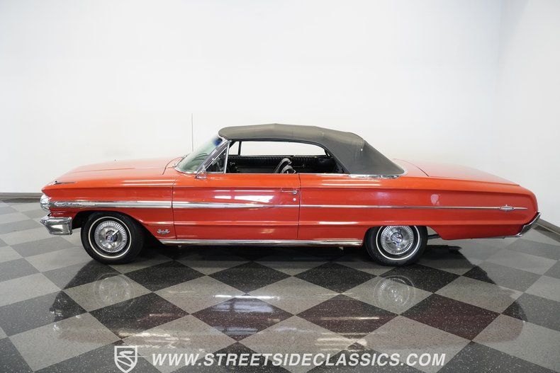 Top-of-the-line Ford convertible for 1964 Optional Z-code 390 engine Ford-O-Matic transmission Rangoon Red paint Power steering Power brakes Dual exhaust with glasspacks Bucket seats Console XL wheel covers Power-operated black top