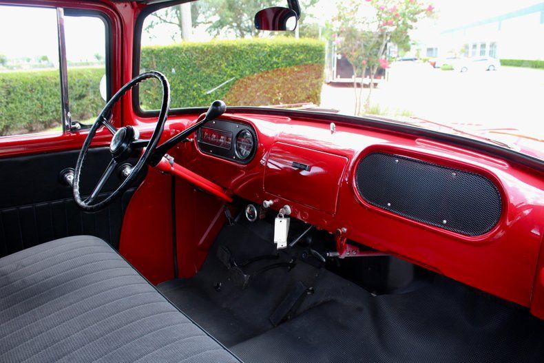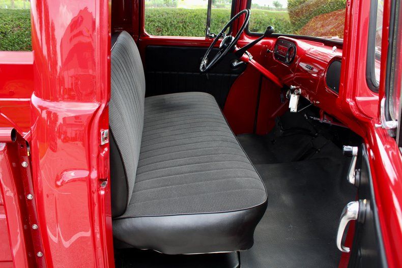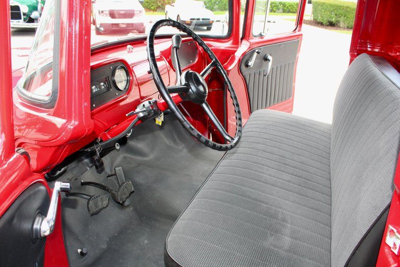 INTERIOR: Original-style cloth bench seat Matching red dash with vintage instrument cluster Factory original wheel with column shift High-visibility "Pilot House" cab with wrap-around windshield