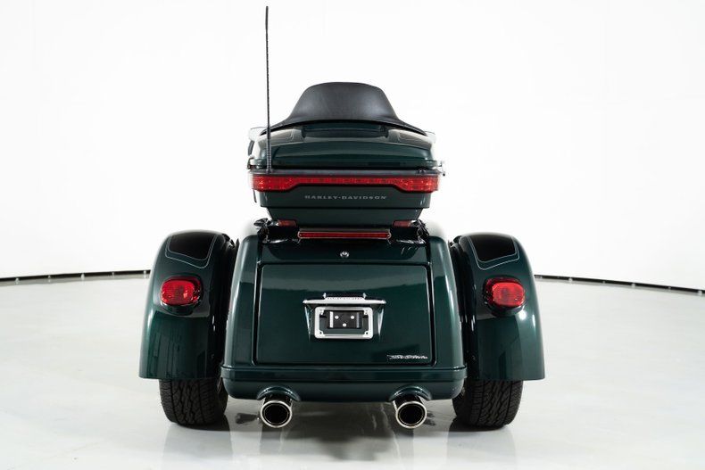Finished in Alpine Green and Black with black leather seats, this Harley-Davidson trike rides on aluminum wheels wrapped in Dunlop radial tires. With only 2,371 original miles from its single owner, it's barely broken in and ready for the road.
