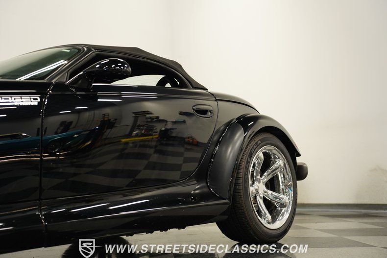 3.5L V6 Engine Dealer-Installed Paxton Supercharger 4-Speed Automatic Transmission Electronic Fuel Injection MagnaFlow Dual Exhaust Power Disc Brakes Front Coilovers Rear Coil Spring, Shock, and Sway Bar New Front End Links Prowler Black Paint Black Cloth Convertible Top 17" Front, 20" Rear Chrome Wheels P225/45R17 Front, P295/40R20 Rear Tires Paxton Supercharger Hood Decals Black Leather Interior with Bucket Seats Console Shifter Boost and AFR Gauges Tilt Steering AM/FM Cassette Stereo Power Windows Air Conditioning