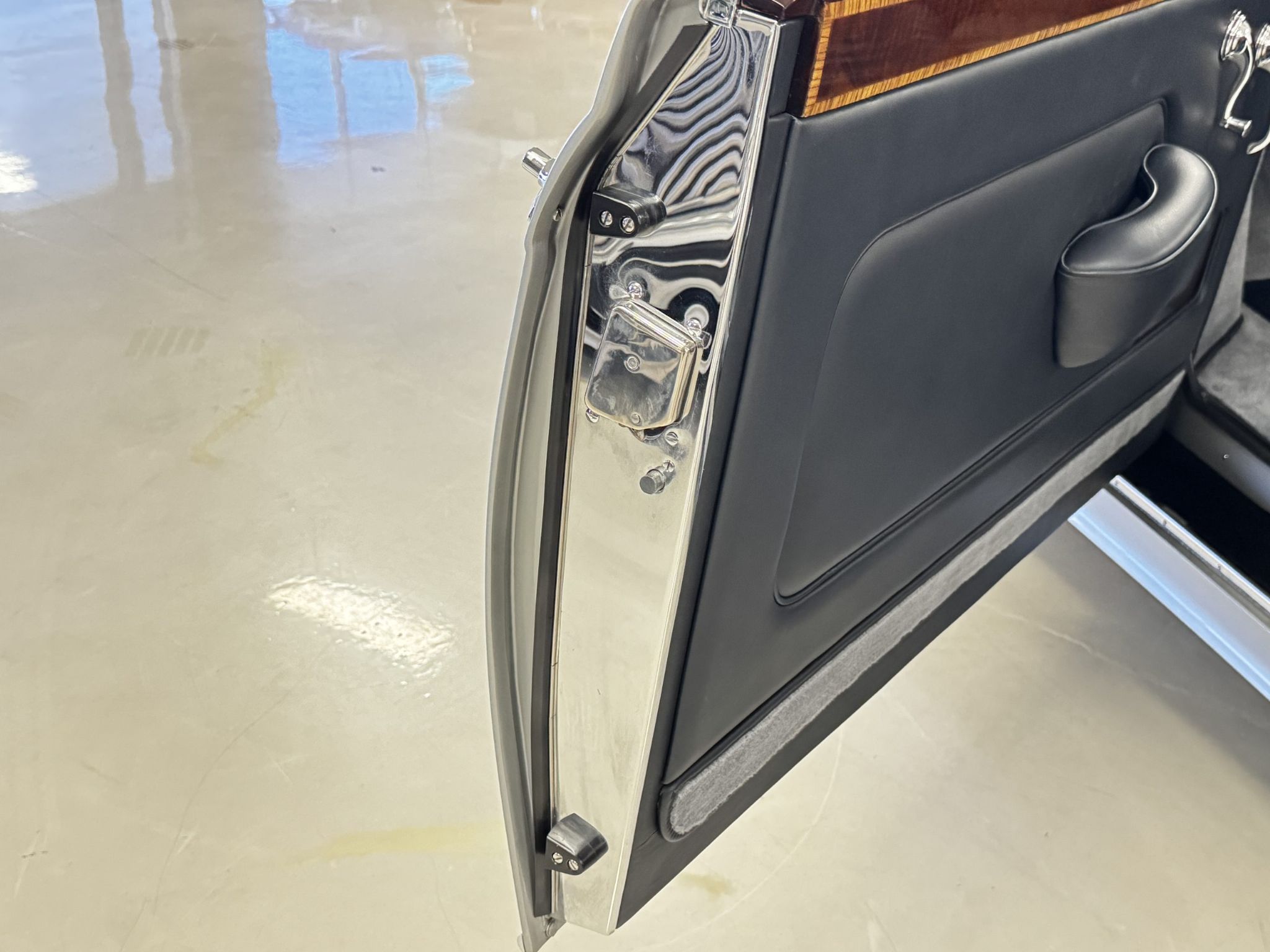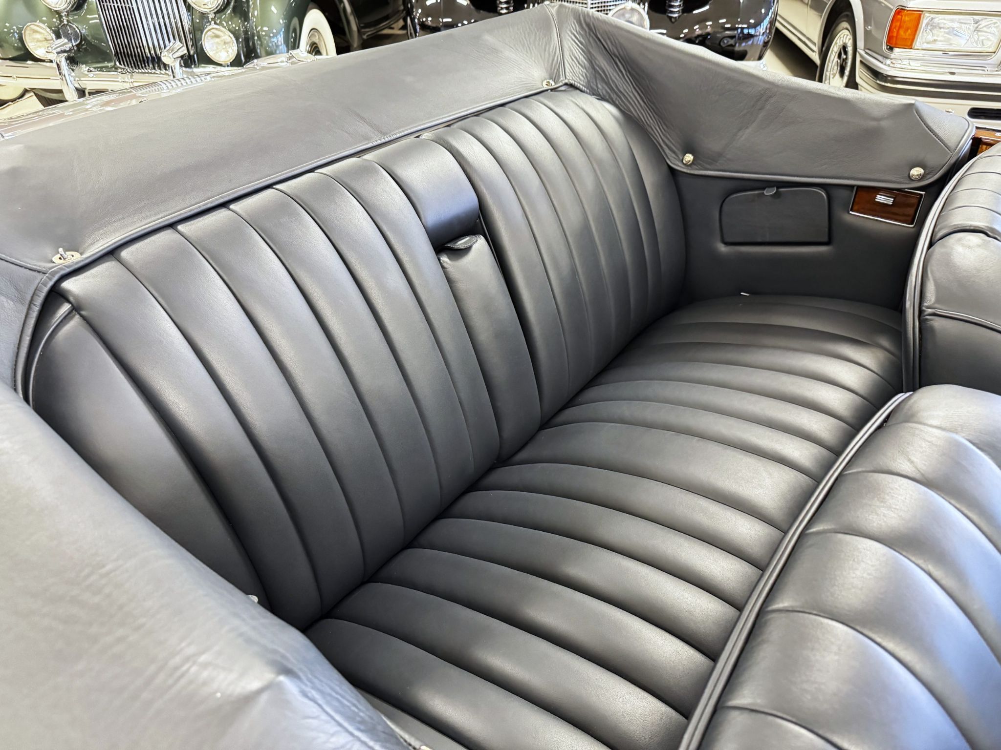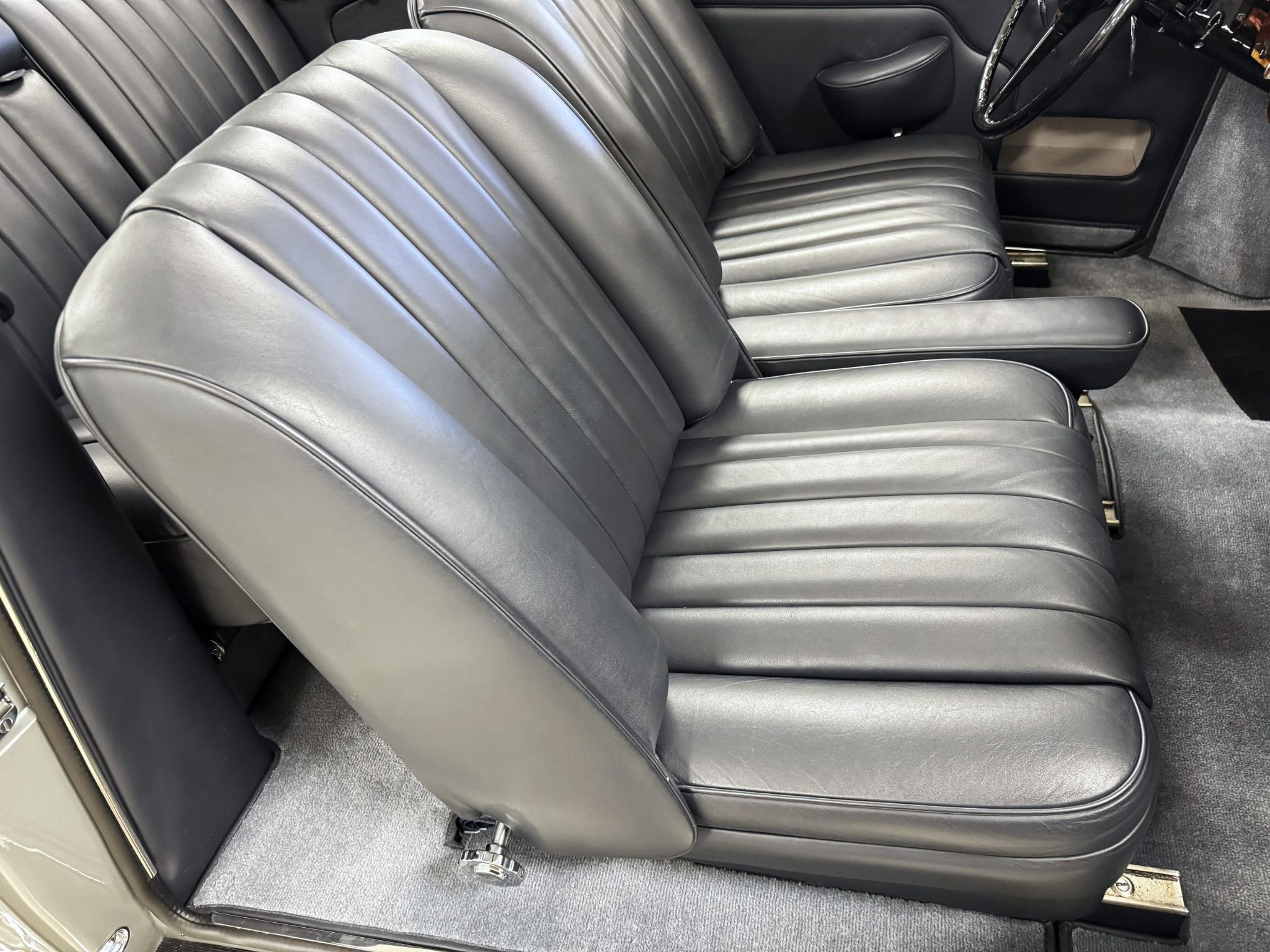 The beautiful interior features Dark Blue Connolly leather that is in excellent showroom condition. Park Wards famous burl walnut and light crossband woodwork is gorgeous and appears perfect. The complementary Light Grey Wilton wool carpet is in excellent condition. During restoration, AC was installed with vents in the rear behind the backseat. All of the instrumentation and original AM radio are in excellent condition.