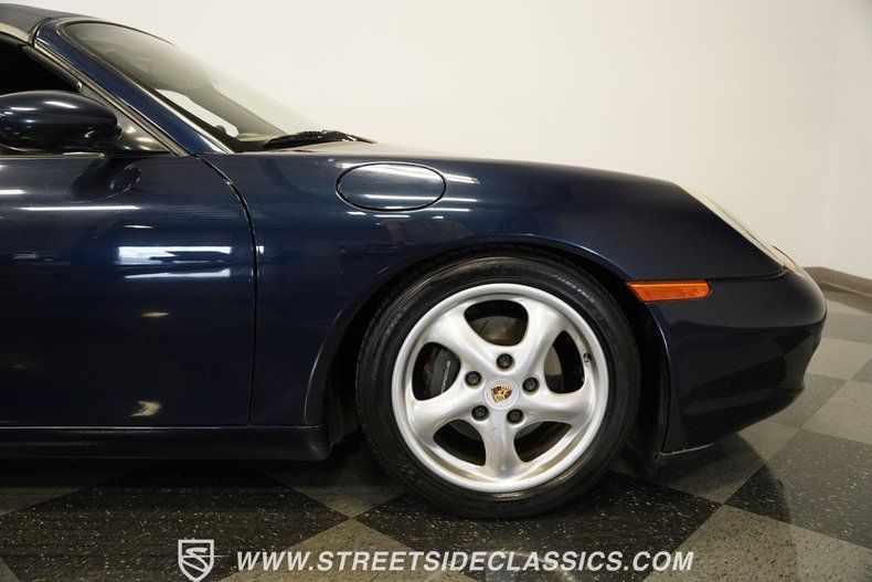 This 1999 Porsche Boxster in Ocean Blue Metallic carries itself with a low-slung stance thanks to H&R adjustable coilovers and matching H&R sway bars. The factory 17-inch alloy wheels are wrapped in Michelin Pilot Sport AS/3 tires, 205/50ZR17 up front and 255/40ZR17 in the rear. The power-operated blue canvas top keeps everything tight above, and the clean lines front to rear stay true to the mid-engine shape that defined the Boxster's identity.