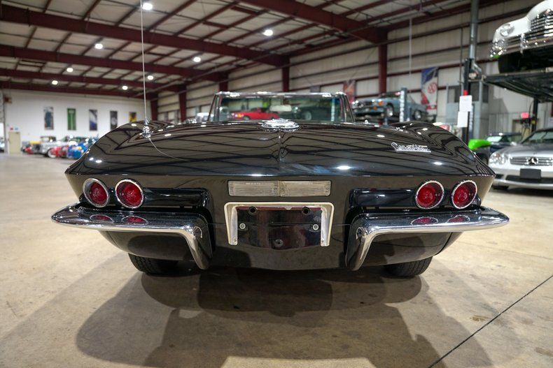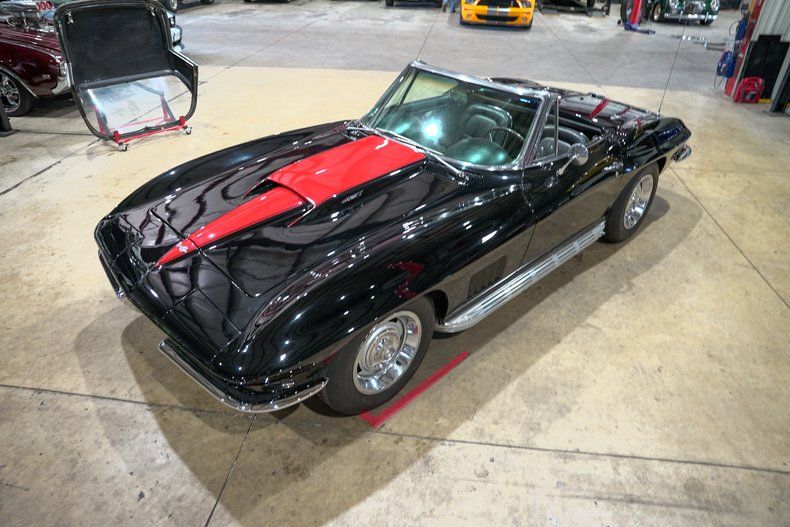 GR Auto Gallery is excited to present this 1967 Chevrolet Corvette Stingray Convertible, finished in sinister Tuxedo Black with a black leather interior, black soft top, and matching black removable hardtop. The '67 model marks the final year of the iconic C2 generation, and this example captures everything enthusiasts love, sweeping fender lines, flip-up headlights, side exhaust, and just the right amount of chrome to balance its aggressive stance. It rides on 15-inch steel wheels with factory-style chrome covers that complete its factory-correct look.