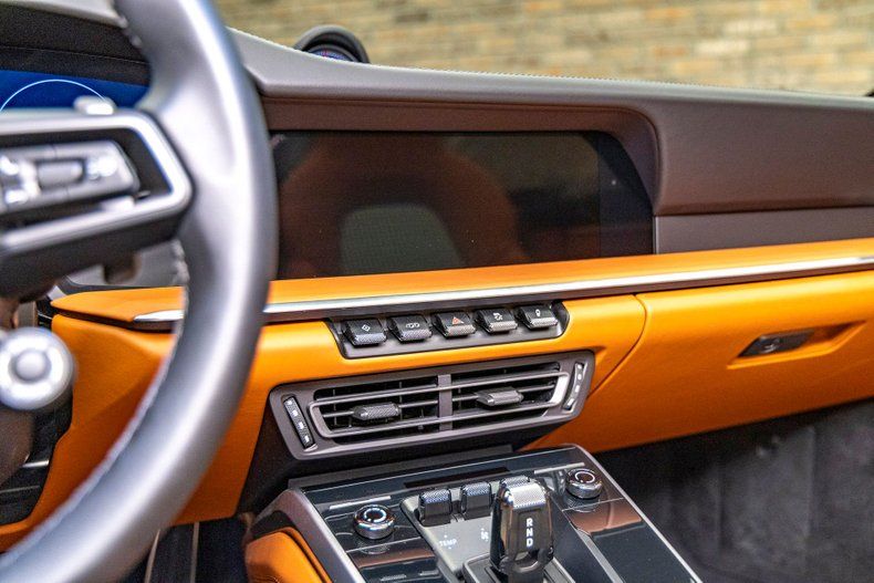 Step inside and you're greeted by a cabin that artfully blends retro cues with modern comfort. The Heritage Design Package sets this example apart, with smooth Black and Semi-Aniline Classic Cognac leather covering the Adaptive Sport Seats Plus. The seat inserts feature classic black-and-white houndstooth fabric, a nod to the iconic interiors of 1960s-era 911s. Heritage Design floor mats, extended leather trim, and exclusive stitching elevate the atmosphere while remaining true to Porsche's legacy of craftsmanship.