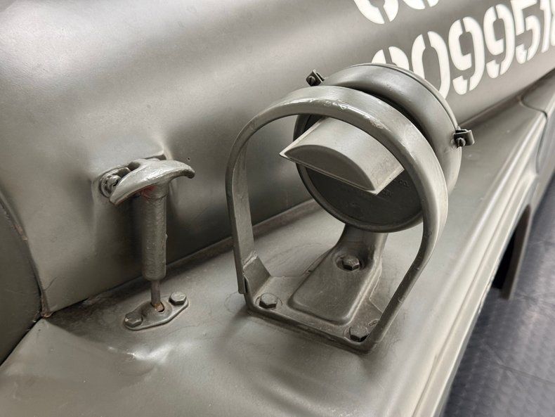 Typical military Olive Drab covers the 4x4 and trailer and is adorned with contrasting white stenciled writing and Army stars, and the 16-inch steel wheels share in the olive coverage. Up front, the utilitarian bumper is topped with a pair of tow shackles under the seven slot grille and siren on one fender and night light on another and everything from the hinges to the hardware share one color. A pintle style hitch hooks the to the trailer and safety chains, olive green of course, secure it in place and a Jerry can is mounted to the back of the Jeep. Exterior features include a whip antenna secured to the cowl, a snorkel air intake that rises with the windshield, and of course, the machine gun which is equipped with propane to create harmless, flared popping. The flat trailer has a rugged canvas top secured to the unit with rope. Overall, the truck and trailer are in good shape with no major dents. Imperfections include some bubbling, cracked paint, uneven filler, and paint runs.
