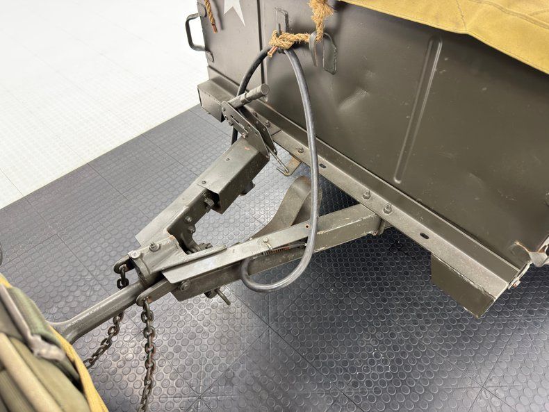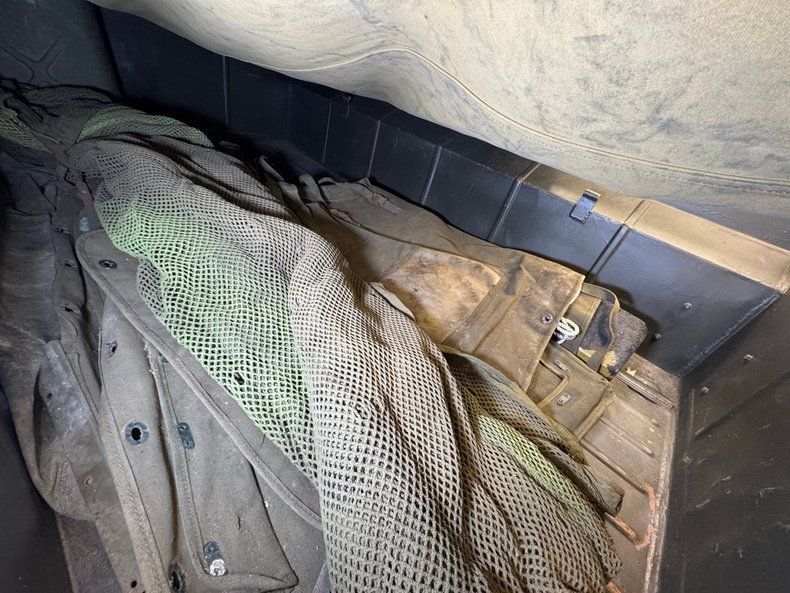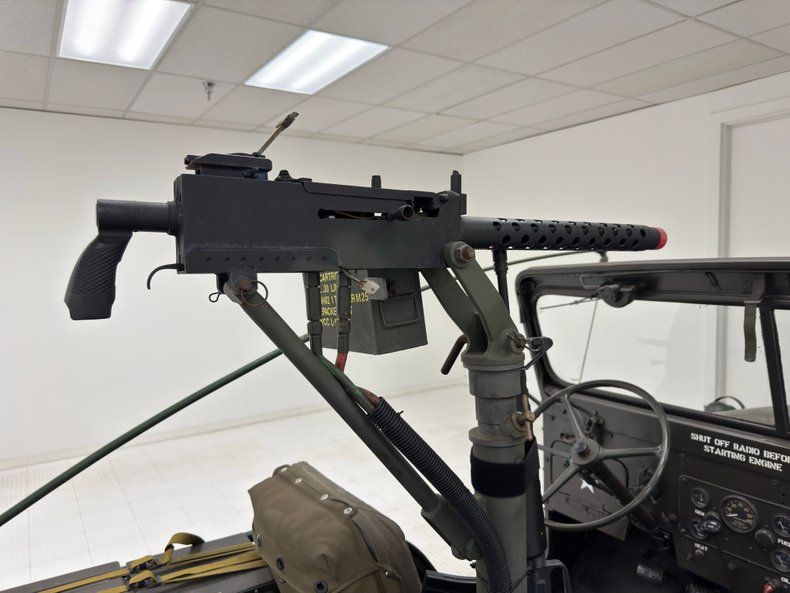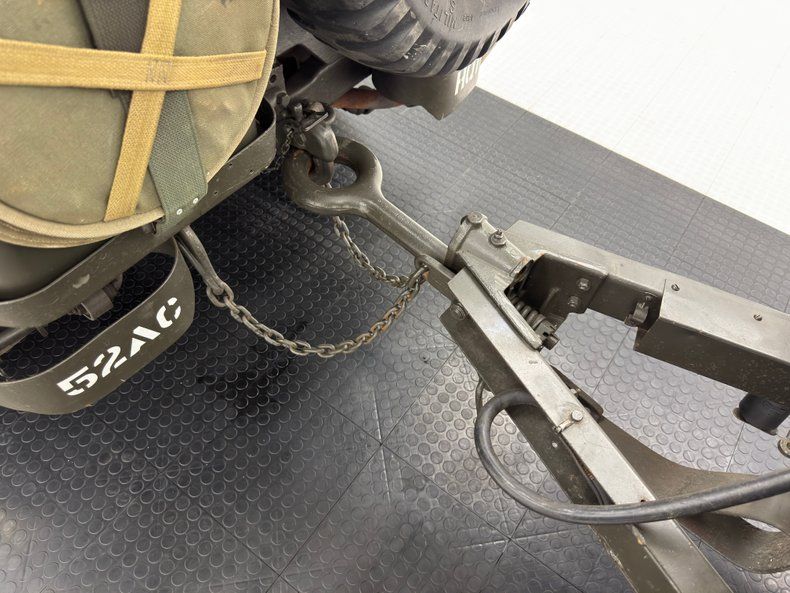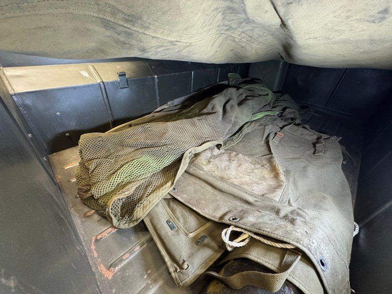 The doorless Jeep features olive green padded seats with the driver's riding above the gas tank. In back, a straight bench can seat a couple more infantrymen who can keep tabs on the radio equipment and the six secured ammo boxes that reside nearby. There's a first aid kit, some vintage headphones, and canvas storage attached to the front seat backs. Attached to the post of the belt fed .30 caliber machine gun is a plastic rifle, completing the profile as a rolling, ground fighting tool. The basic steering wheel is joined by toggle switches and a center instrument cluster and three, floor mounted shifters for gears and range type. The floor is painted but not covered with anything and the trailer is equally as bare bones, housing a number of canvas pieces.
