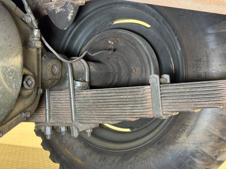 You'll never guess what color most of the undercarriage, frame, and components are painted! It's all business underneath with some serious leaf springs front and rear and heavy duty axles. There's some surface rust present, some old grease, even a bit of oil, but in general the underside is on the clean side. A single exhaust flows through a stock style muffler before terminating just beyond the rear bumper as a tall narrow stack.