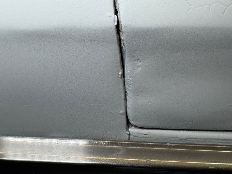 The Goat still clings to the single stage Cameo Ivory exterior and while not perfect, it still looks good from 20 feet. Stacked quad headlights flank the split grille which house the marker lights and our driver's side light is slightly askew, almost like a wink. The arrowhead is in line with the hood scoop and from the front, the asymmetric profile is due to the single side mirror, as was typical for the time. The tail lights are extra special, a series of nine slits on each side that form a single unit with plenty of white space in between at the end of a long decklid. Our wheels here are Pontiac Rally II's and they carry 70 series tires with a mid 2024 date code. Imperfections begin on the door corner where some uneven filler is found, there's bubbling in spots especially at the rocker panel, cracking paint, and general patina.