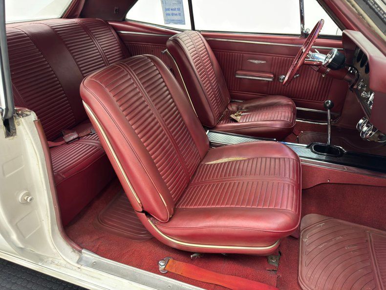 Red vinyl is the choice here and while it appears clean and intact on the door panels, the driver's seat is torn and compressed, and the passenger side has a tear. Conversely, the rear bench looks as if no one has been back there. Red covers the steering wheel and dash surround while wood veneer backs the instrument cluster fronted by the tachometer on the column and this wood shows some age. The AM radio and fan controls appear as they did in 1966 and a pair of more modern gauges are added under the dash to monitor oil and water. A Hurst shifter is offset in the center console to cater to the driver and look original while semi plush red carpet floods the floor, showing a touch of age and the headliner is in great shape, also red. The trunk is clean and contains a period plaid mat and spare tire.