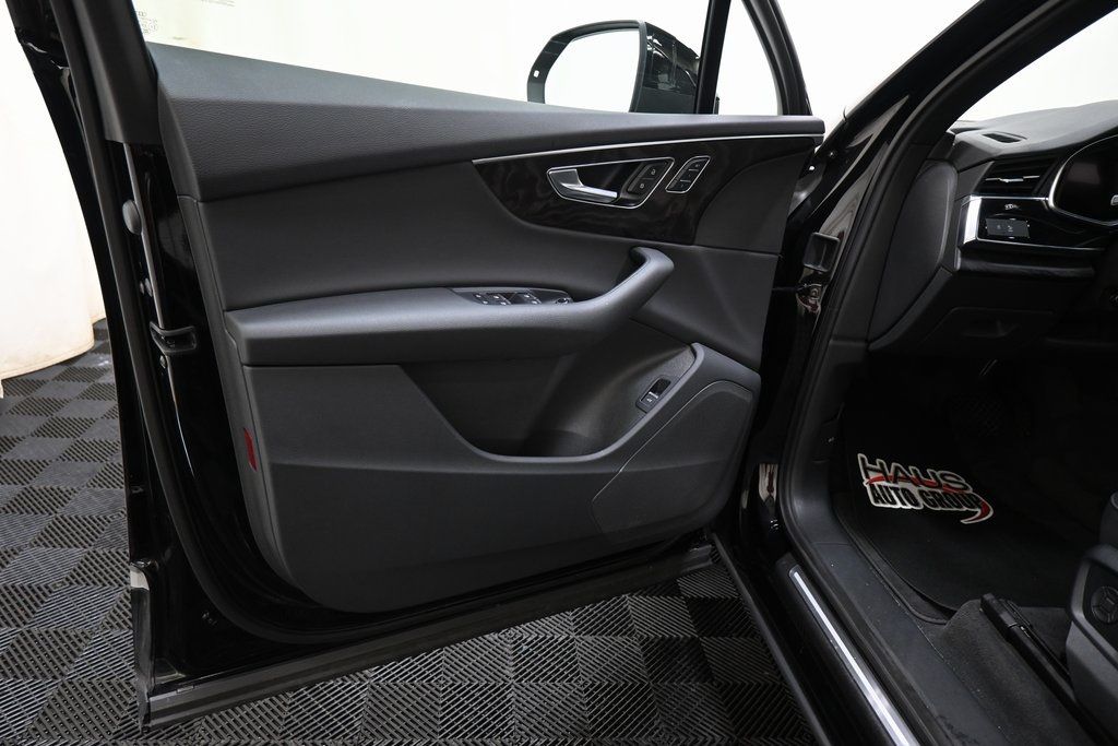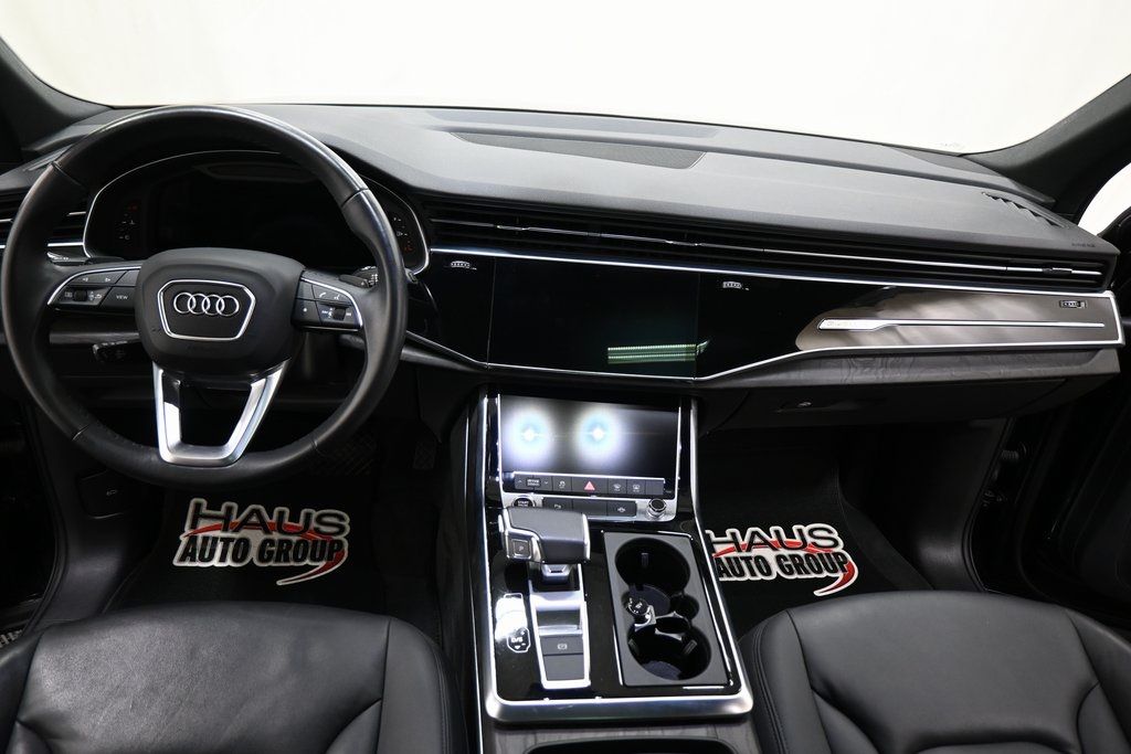 2021 Audi Q7 55 Premium quattro Night Black 3.0L TFSI V6 DOHC quattro 8-Speed Automatic with Tiptronic 3rd row seats: bench 4-Wheel Disc Brakes ABS brakes AM/FM radio: SiriusXM Audi smartphone interface (Apple CarPlay/Android Auto) Automatic temperature control Exterior Parking Camera Rear Front dual zone A/C Fully automatic headlights Genuine wood door panel insert Heated front seats Memory seat Navigation system: Audi MMI Navigation plus with Touch Response Power driver seat Power Liftgate Power moonroof Rear fog lights Speed-sensing steering Traction control Turn signal indicator mirrors.