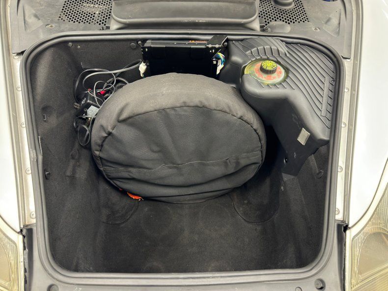 Interior Porsche exterior designs are special and the same can be argued about their interiors. Navy Blue leather is a great complement to the silver exterior and includes silver accents to make an even stronger bond. The door panels consist of navy leather, black door pull and armrest, and a curved base of plush lavender carpet. High backed bucket seats have ample side bolstering and a simple stitched pattern with some patina and the driver's seat shows just a bit more age with wrinkles but no rips or blemishes to detract from their inviting shape. The arched roll bars sit just above the carpet covered back wall. A standard black steering wheel leads to the gauge cluster which consists of three overlapping white faced circles with Boxster font letters and numbers. Like all good sports cars, the tach is front and center. Quality textured plastic wraps the entire dash, and the black center stack includes the climate controls and an AM/FM/CD radio with AUX and USB ports. It flows into the black center console where the automatic shifter is mounted in a robust plastic base. Plush lavender low pile carpet covers the floor and is protected by fitted Porsche carpeted mats. The trunk and frunk are lined with charcoal carpet and both are clean.