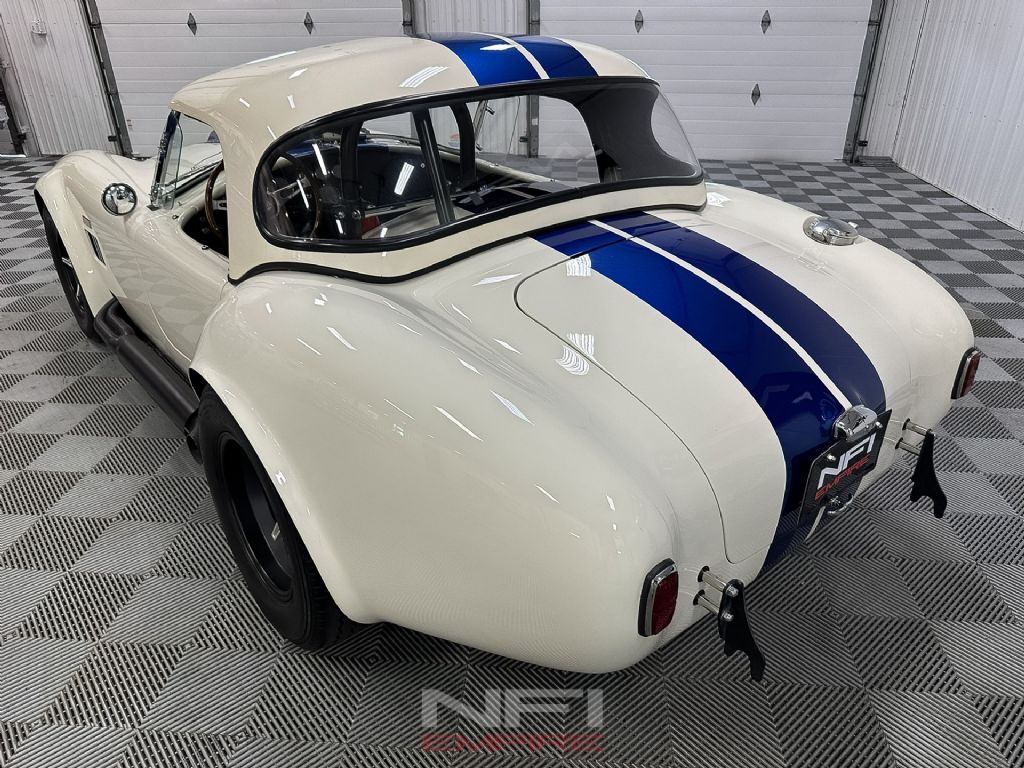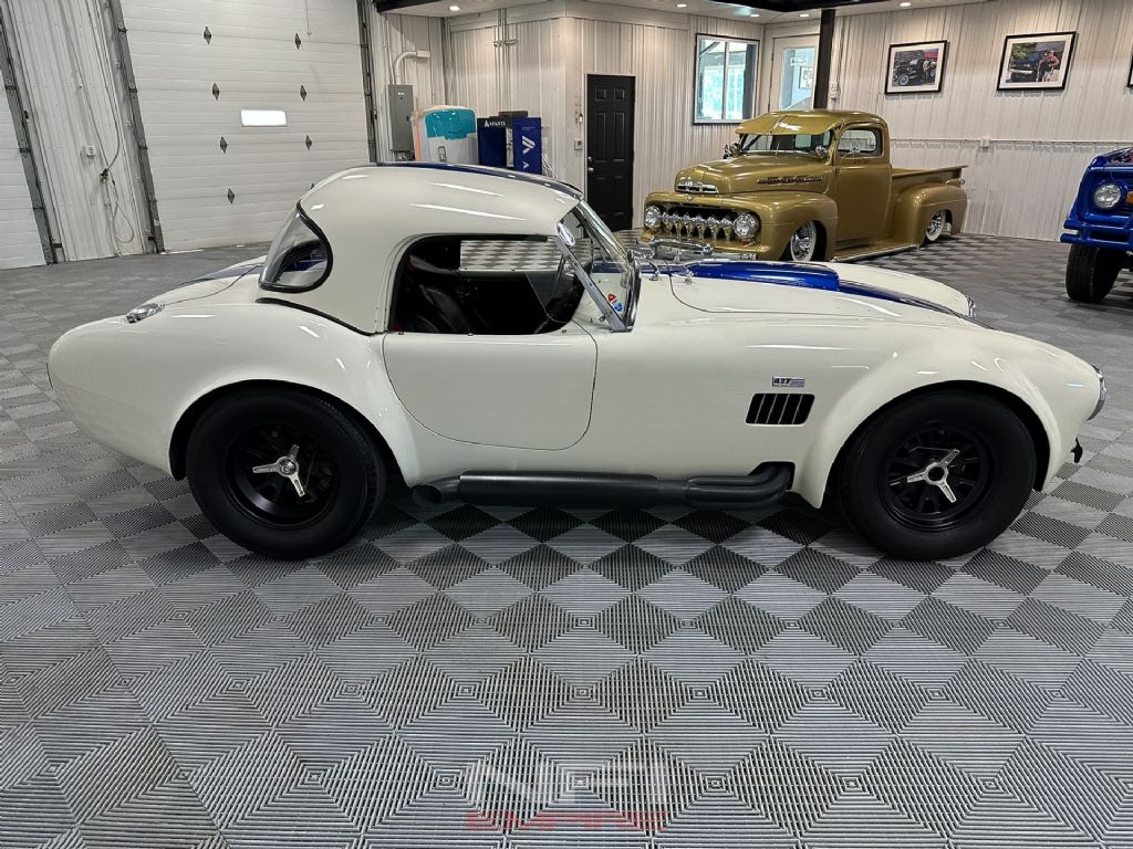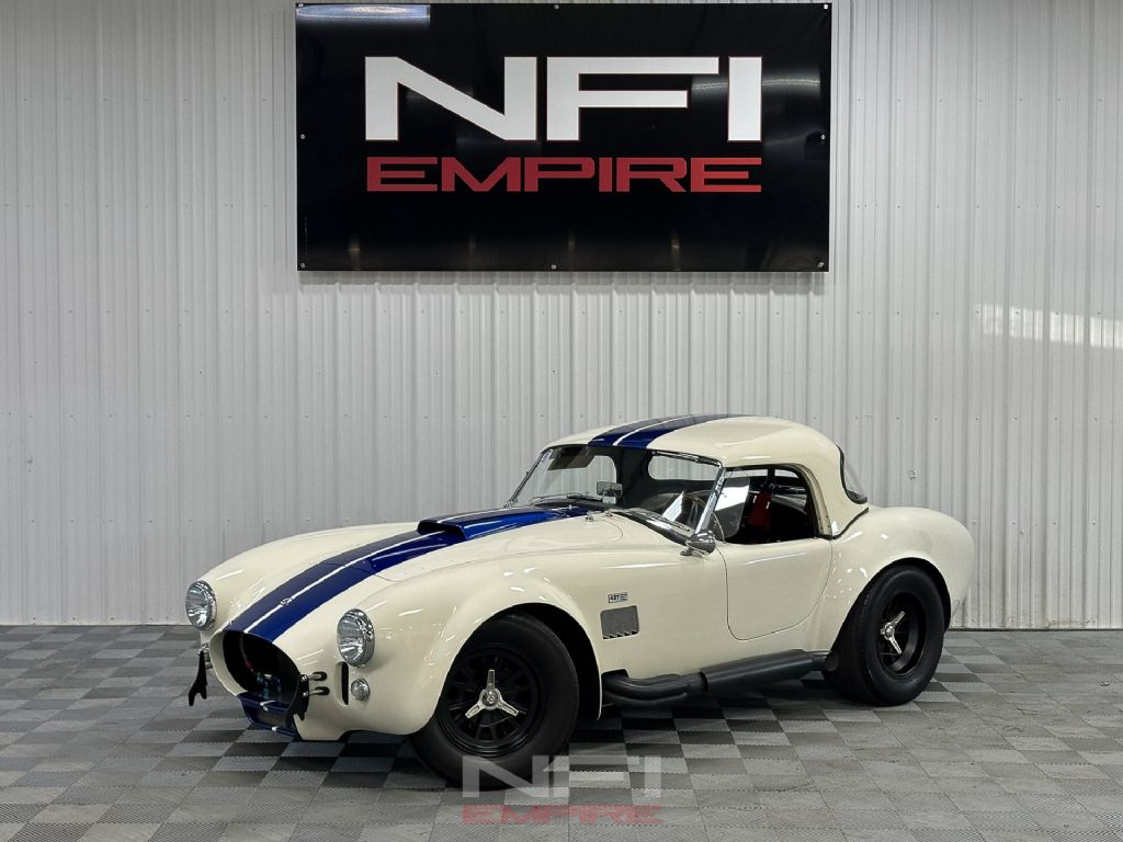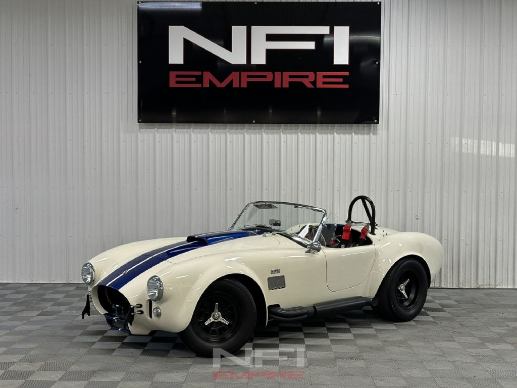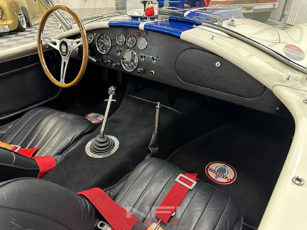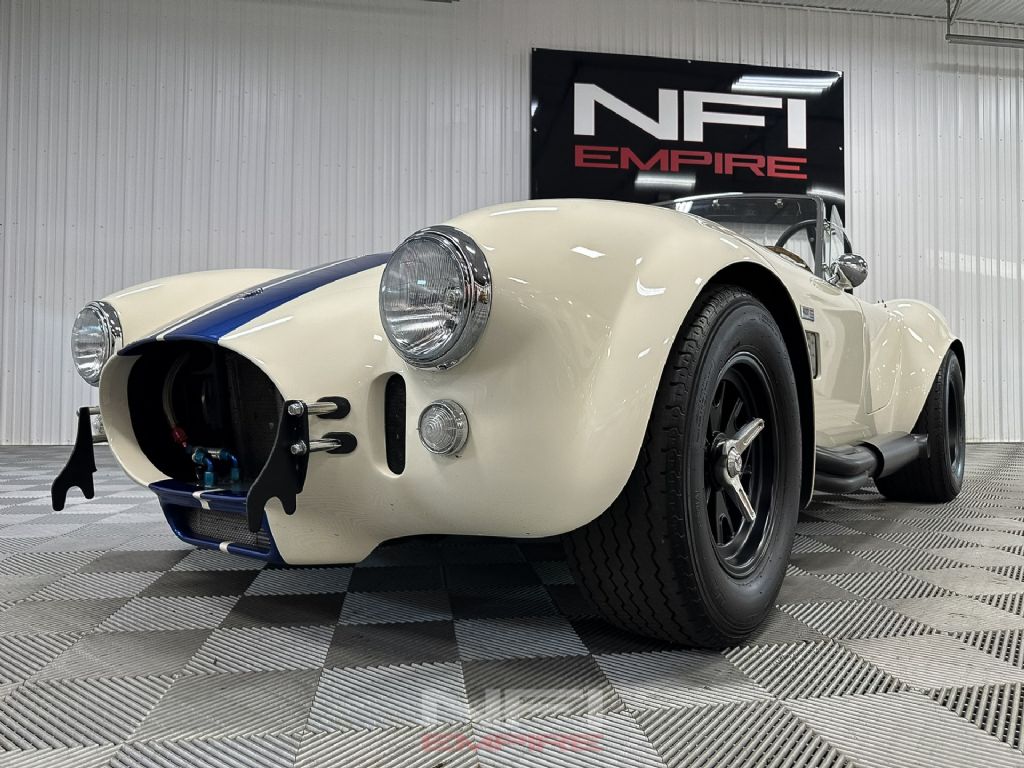 1965 Shelby Cobra MK III Superformance - the kind of car that stops people mid-stride and keeps them staring. Finished in classic white with bold blue stripes, it comes with a matching hard top for when the weather isn't as fearless as you are. Under the hood sits a 418 V8 with a dry sump oil system, fed by a Holley carb on an Edelbrock intake, breathing through a K&N air cleaner. An MSD Blaster 2 ignition keeps the spark strong, while long-tube headers feed the signature sidepipe exhaust - loud enough to make your neighbor's coffee tremble.