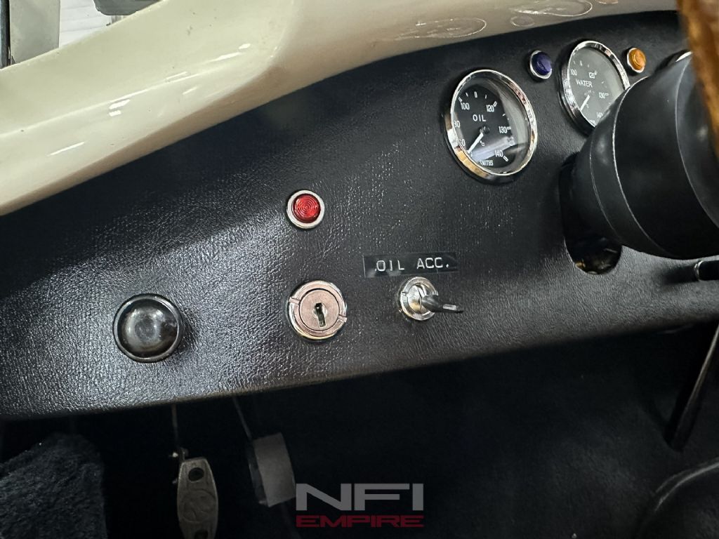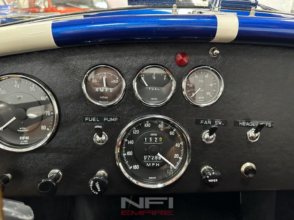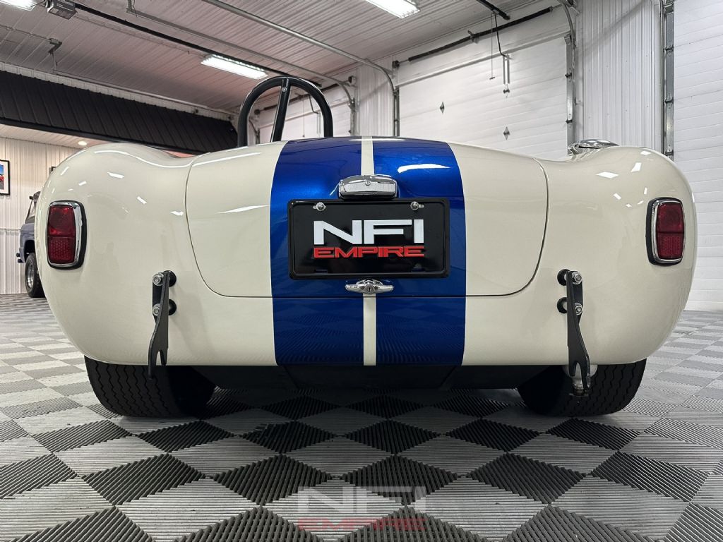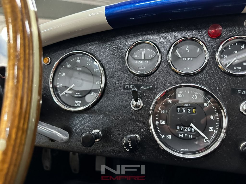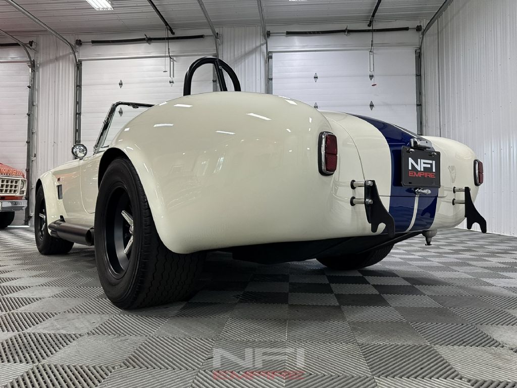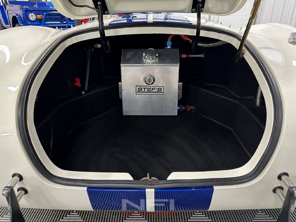 1965 Shelby Cobra MK III Superformance - the kind of car that stops people mid-stride and keeps them staring. Finished in classic white with bold blue stripes, it comes with a matching hard top for when the weather isn't as fearless as you are. Under the hood sits a 418 V8 with a dry sump oil system, fed by a Holley carb on an Edelbrock intake, breathing through a K&N air cleaner. An MSD Blaster 2 ignition keeps the spark strong, while long-tube headers feed the signature sidepipe exhaust - loud enough to make your neighbor's coffee tremble.
