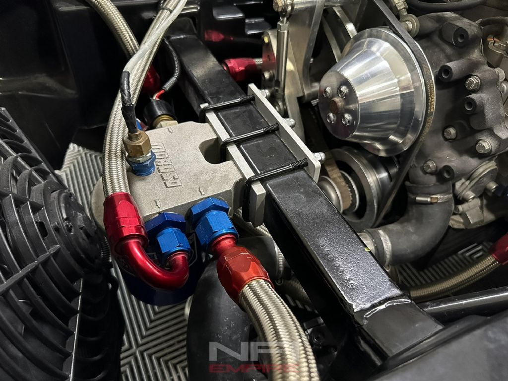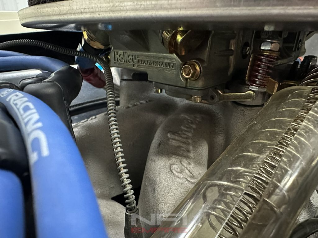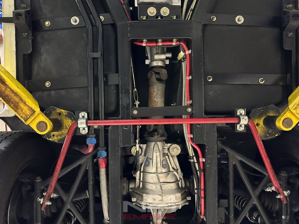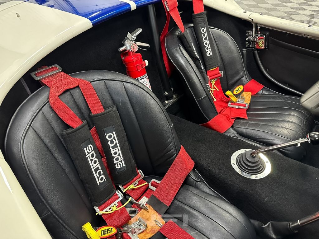 The 4-speed manual puts you in command, backed by 3.73 gears, coilovers, and sway bars front and rear to keep all that muscle pointed in the right direction. Inside, it's stripped down and purposeful: black upholstery, clean dash with clearly labeled switches, classic Smiths gauges, and Diest racing harnesses to keep you planted when the road gets lively. Rolling on 15-inch wheels with 245/60 tires up front and 295/50s in the back, it has the right stance and grip to match its bite.