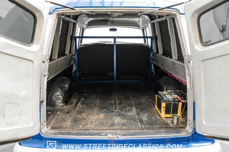 Take a peek inside and you'll see a comfortable, gray cloth bench seat that blends well with the two-tone door panels on both sides that have been left in their original bare-steel configuration to give this already rugged-looking interior an even more robust appearance. The interior retains a great vintage look, with some modern conveniences added to increase overall driving comfort, including an AM/FM/CD stereo, and an aftermarket air conditioning system that's in good form to keep you cool should outside temps rise. Below the dash, an assembly of Auto Gauge gauges sits ready to monitoring motoring functions. Take a look in back via the set of signature ambulance-style doors, and you'll see the rear seat has been deleted, creating a lot of usable space and exposing the wood plank-lined rear compartment to add even more classic appeal.