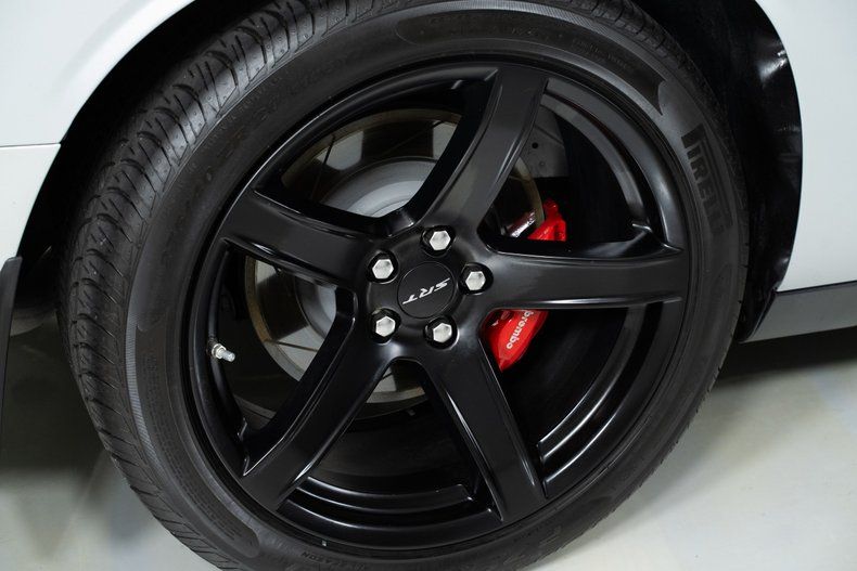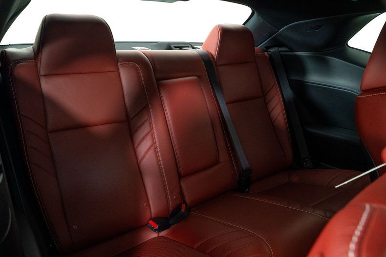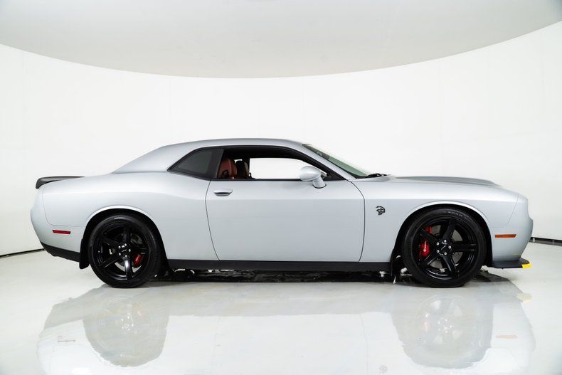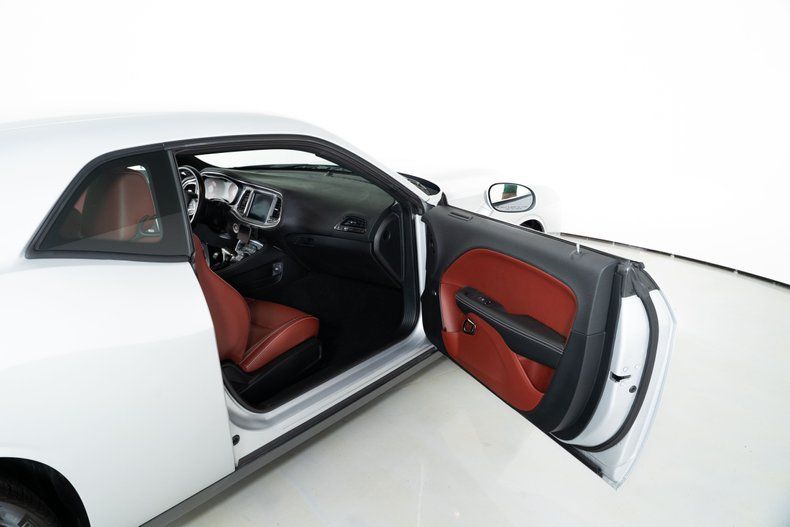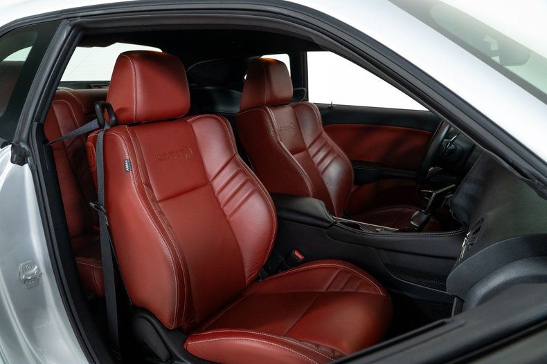 The exterior is finished in Triple Nickel, a sleek metallic silver that contrasts perfectly with the Demonic Red leather interior. The SRT performance spoiler, Laguna Leather Package, and Power Chiller Plus Package add to its aggressive personality and track-ready capabilities. Inside, comfort meets power with the Preferred Package 27Z, bringing premium touches to the cockpit of this Challenger Hellcat.