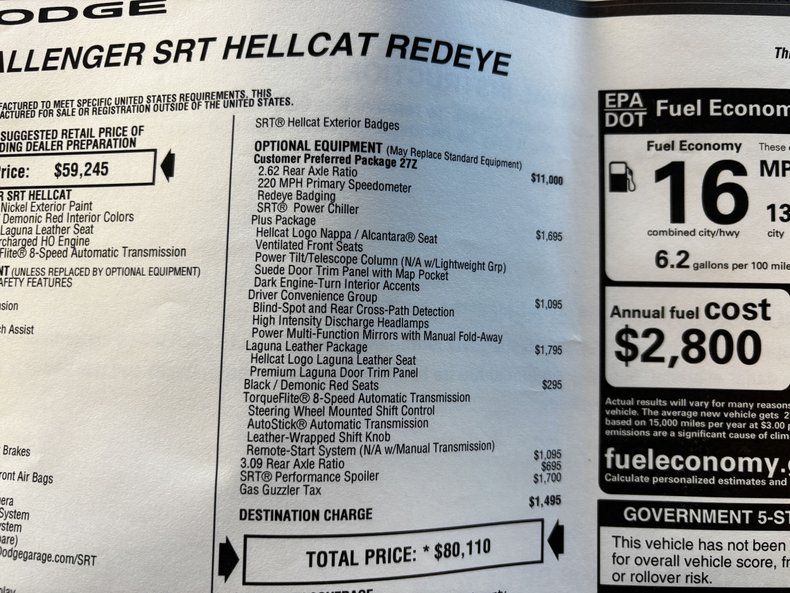 This 2019 Dodge Challenger Hellcat Redeye takes modern Mopar muscle to the extreme! Beneath the hood sits a 6.2-liter supercharged V8, tuned with Direct Connection Stage 1 and Stage 2 upgrades to unleash an astonishing 840 horsepower. Paired with the TorqueFlite 8-speed automatic transmission and an optional 3.09 rear axle ratio, this Hellcat Redeye delivers ferocious acceleration while still offering smooth highway cruising.