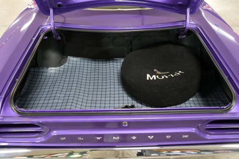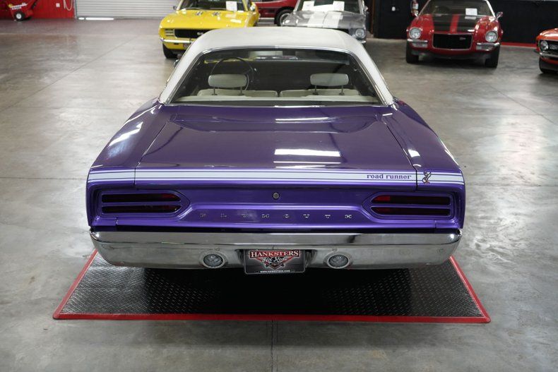 This 1970 Plymouth Roadrunner is a classic Mopar muscle car featuring its numbers matching 383 Magnum V8 and 727 Torqueflite automatic transmission. Backed by a Chrysler 8 3/4 rear end with a 2.76 gear ratio, it offers highway cruising power with vintage muscle. Equipped with power steering, front disc brakes, and rear drums, it balances performance and drivability. The car rides on 15" American Racing AR61 Outlaw wheels wrapped in Cooper Cobra Radial G/T tires. Finished in eye-catching Plymouth In-Violet paint with a white vinyl interior, this Roadrunner embodies true 1970s muscle. A rare and iconic piece of automotive history.