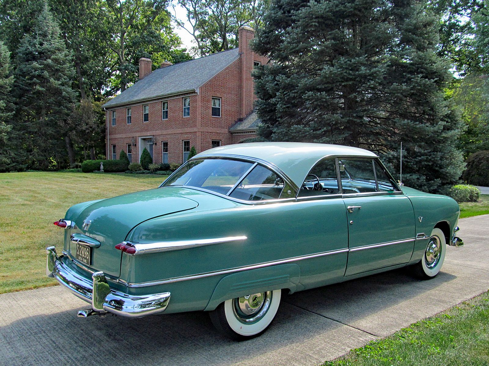 1951 Ford Custom Victoria Hardtop Coupe with OVERDRIVE. Call Pete or Andy 419-668-1884. Spectacular! The 1951 Model 60 Victoria was the first hardtop ever produced by Ford Motor Company. The stylish new automobile was designed by Gordon Buehrig of Auburn Cord Duesenberg fame. This example was built on June, 9th 1951 in Dearborn Michigan and is restored to a very high standard. Finished in color code correct Greenbrier Green Iridescent with a Sea Island Green roof. Trim code correct Green “Craftcord” interior. Powered by Ford’s Famous 8BA Flathead V-8 which was rated at 100 horsepower. Three speed manual transmission with OVERDRIVE. This great Ford has lots of great features. AM Radio. Clock. Day-Nite Rearview Mirror. Driver Side Mirror. Fender Skirts. Ford Script Exhaust Deflector. Ford Script Glass. Heater. Turn Signals. Firestone Wide White Wall Tires. The doors even lock and unlock with the key! Excellent road manners. Ready to Drive, Show and Enjoy. Call Pete or Andy 419-668-1884 BE SURE TO WATCH THE VIDEO!