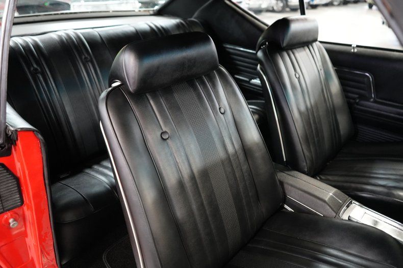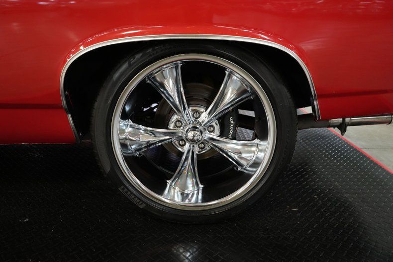 This 1969 Chevrolet Chevelle blends classic muscle with modern upgrades. Under the hood, a powerful 396 Big Block Chevy V8 is paired with a 700-R4 automatic transmission and a 10-bolt POSI rear end featuring 3.73 gears. Stopping power comes from 4-wheel Wilwood disc brakes, while the ride is enhanced with 17" front and 20" rear Ridler 695 chrome wheels wrapped in Michelin and Pirelli tires. A black vinyl interior complements the aggressive red exterior with bold black stripes. Additional performance highlights include an Edelbrock intake, Holley 4-barrel carb, MSD HEI Flamethrower distributor, electronic ignition, and dual Derale electric cooling fans.