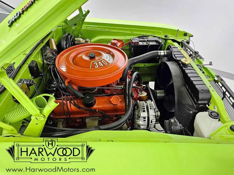 The engine is a correct 340 cubic inch V8 topped by a 4-barrel carburetor. It may be the cars matching-numbers engine, but we can neither confirm nor deny since weve been unable to find any numbers in the usual locations. That doesnt mean theyre not there, but were not really willing to scrape off a lot of paint to find them. At any rate, its rebuilt to stock specs and highly detailed, including that big air cleaner assembly with reproduction decals, proper Hemi Orange engine enamel, and correct accessories. It starts easily and once its off the choke, its ferociously fast, particularly for a small block. A big radiator lives up front, so it always runs cool, and power steering and power disc brakes make it easy to handle in todays traffic. The TorqueFlite 3-speed automatic snaps through the gears without any effort, and with 3.23 gears in the 8.75-inch rear end, its a comfortable cruiser on the highway. The undercarriage is nicely detailed, and we like the contrasting colors that make it look factory-correct. The dual exhaust system features stainless mufflers that sound spectacular, and it ends in correct polished quad tips under the rear valence. There are a lot of new parts under here, including lines and hoses, a new gas tank, and recent shocks, so the car is ready to drive. 17-inch Rallye replicas look spectacular and carry staggered 225/50/17 front and 235/60/17 rear for a performance rake.