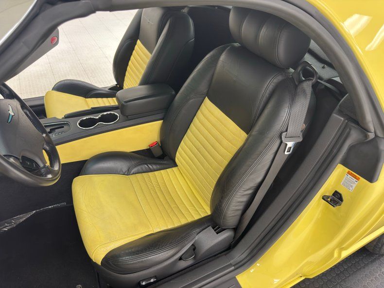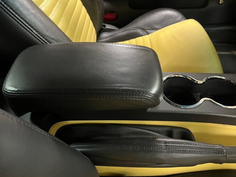 The dual bucket interior in black and Inspiration Yellow leather wraps numerous surfaces, with only the buckets showing slight age wrinkling on the smooth bolsters. No errors here on the carpet, headliner of the hardtop, or dash surfaces. White faced gauges with black numbers and indicators are embedded into the curvaceous dash and are fronted by an original steering wheel. These surrounding surfaces are also using the black and yellow motion colors. This includes the snappy center console presenting with a black top and yellow sides. Dual temp zones, an AM/FM/6 CD stereo, power seats, power locks, and power windows, along with a tilt and extending memory steering wheel column are some of the options on this highly appointed car. Even the door panels get into the retro action with a mix of smooth black plastic, ribbed black vinyl and a yellow vinyl insert all looking good.