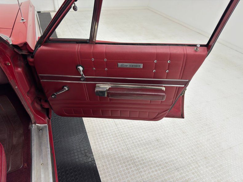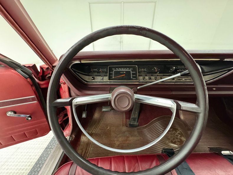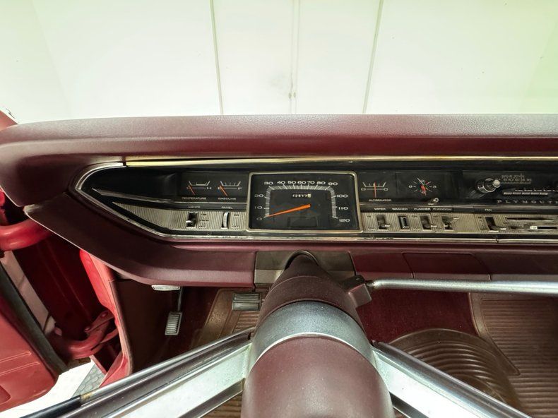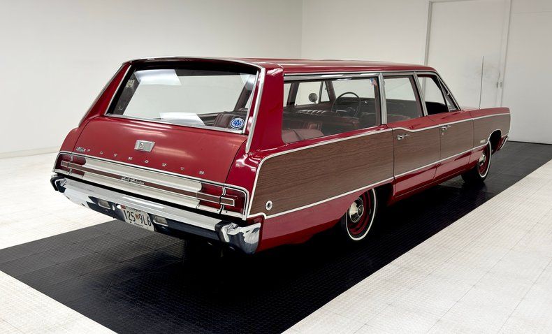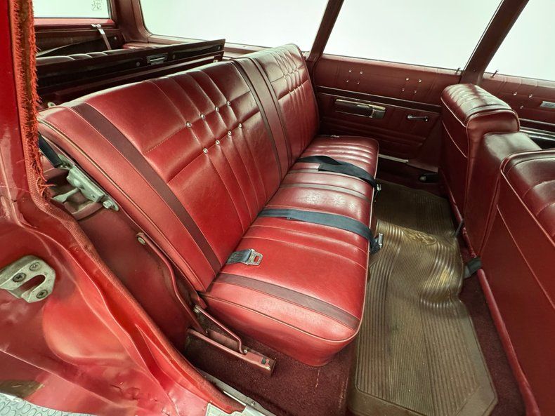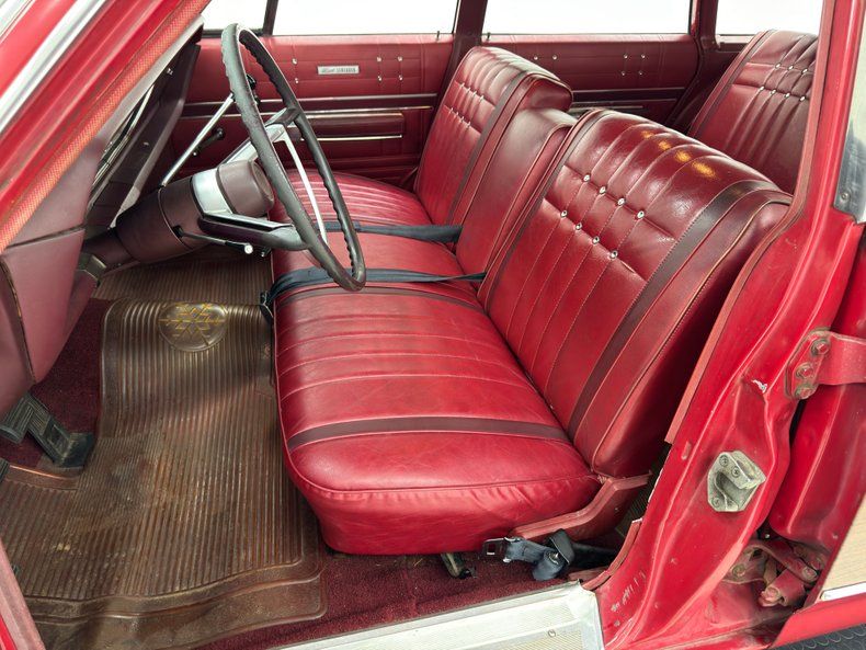Exterior Gloriously 60's in every way, the long panels are of course adorned with woodgrain applique framed by single stage Matador Red rolling on red 14-inch steel wheels with Plymouth hubcaps. The Fury looks a little furious with the stacked headlights and narrow grille, a squared grimace at the head of a long car, 217 inches in all, with an extended overhang past the rear axle. A flat roofline parallels the shoulder line and between them, glass on glass, a giant greenhouse out from which we watched the world go by, (you know, before iPhones!). The back of the car is a clinic in right angles and a big picture window which would become an entertainment screen for those behind you. The tail lights are integrated into the aluminum bar across the back, low on the body, are fantastic. Imperfections include some scratches, surface rust on the wheels, and just general overall patina that frankly, we wouldn't touch!