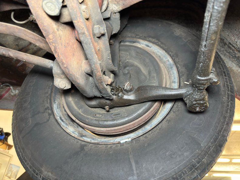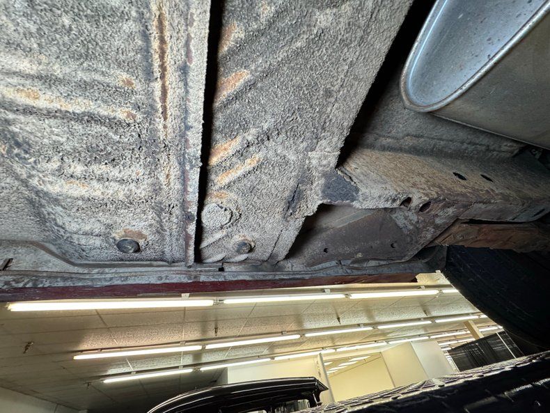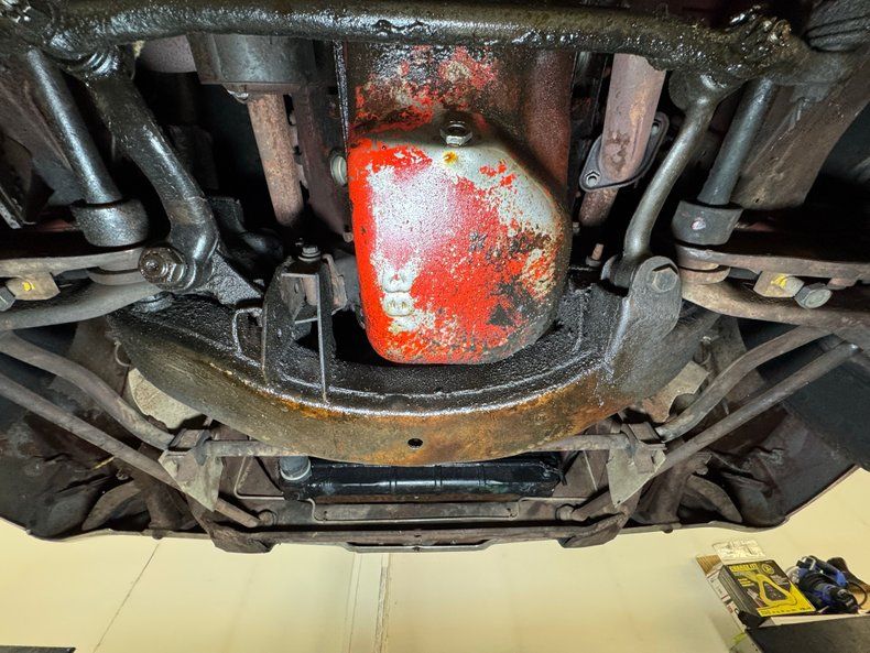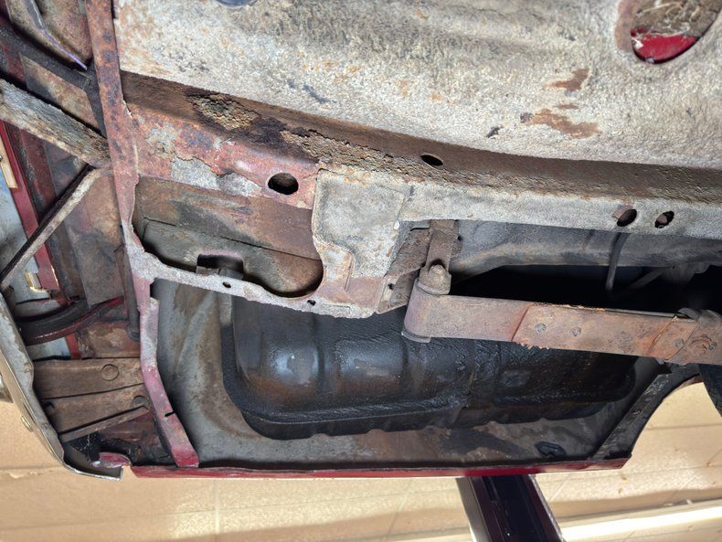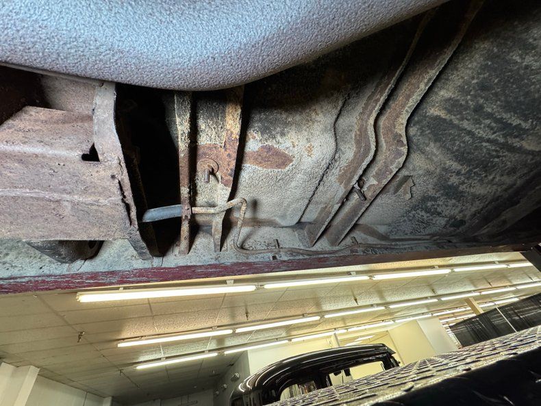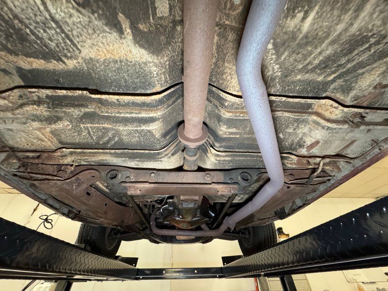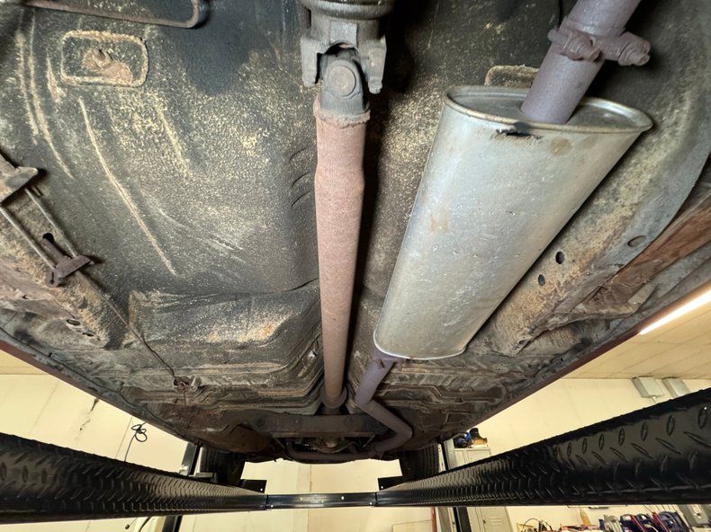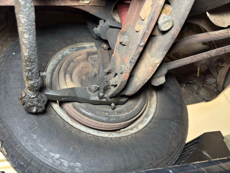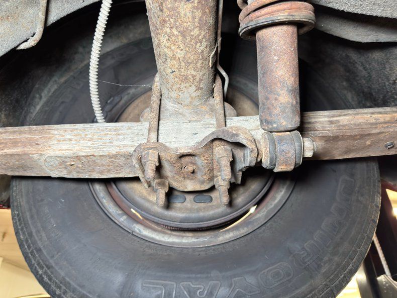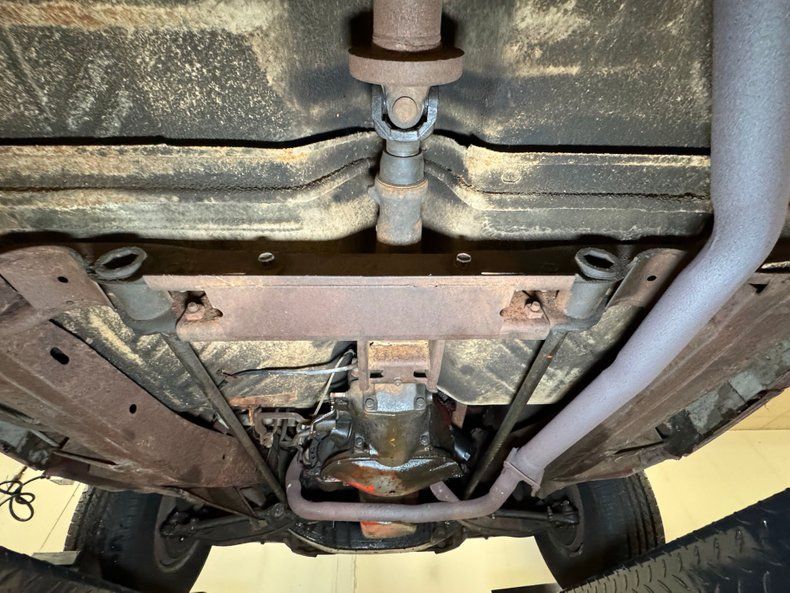 Undercarriage Amazingly, no invasive rust is to be found. Plenty of surface stuff as expected and some residual oil on the transmission pan and rear differential along with some grease build up around the knuckles are noted. The single exhaust flows through a stock style muffler before finding its end in a steel pipe. Suspension consists of torsion bars up front and leaf springs in the back.