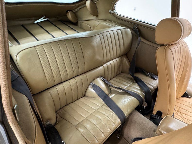 Interior The lap of luxury begins with Biscuit leather, gently bathing the door panels in a simple and sophisticated design, showing a touch of patina on each but fully intact. Step over the wide, leather clad door sill and find yourself immersed in tan leather seats appearing with newer materials, finely stitched in even vertical lines, well padded and curved. The back seats are small but also covered in luxurious leather with patina and a tear. The wood steering wheel with brushed metal spokes is right at home in the car and the E-type horn button is elegant, not something we generally say about horn buttons. A large speedometer and tachometer are straight ahead and a myriad of gauges, toggle switches that are plastic but robust, and a clock occupy the center area, all looking nice. We note some detached material from the dash pad along the front rim. From the dash we move down to the leather covered center console where a stout, wood knobbed shifter sits in plastic housing in front of a leather clad console in a condition consistent with the rest of the interior. The rear hatch opens on side mounted hinges and reveals a cargo area with polished aluminum rails evenly dispersed over the length of the compartment and continuing on the back of the rear seats, a subtle and tasteful design. The plush tan carpet on the floors shows some age while the headliner and pillar treatment are a soft, fleece like material and are in very good shape.